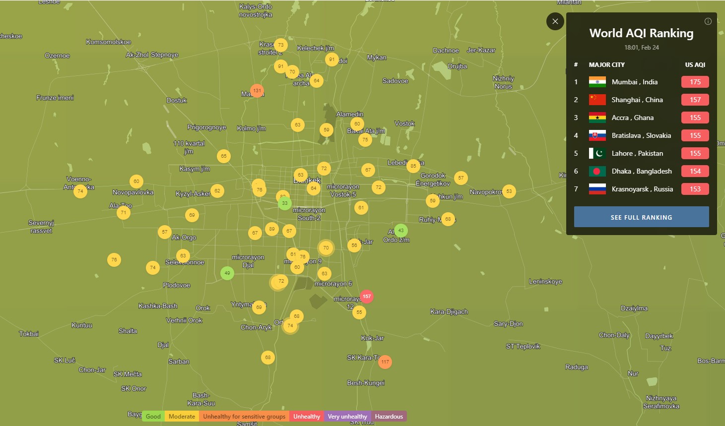 В рейтинге крупнейших городов мира по качеству воздуха World Air Quality Бишкек поднялся на 53-е место.