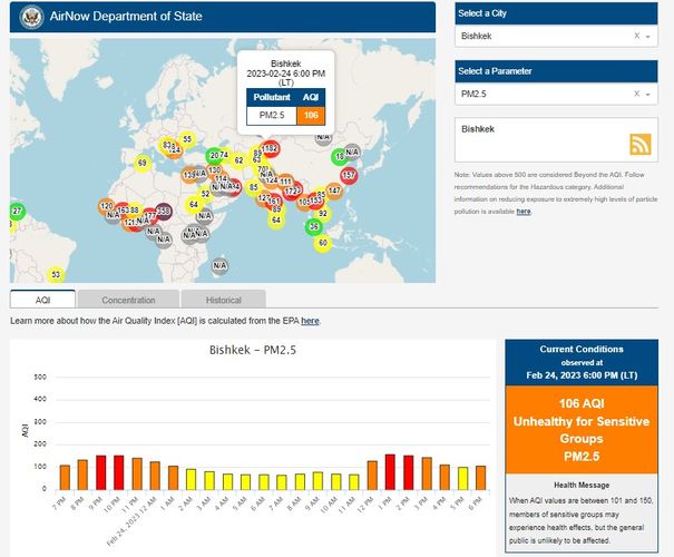 Посольство США в Кыргызстане также установило станцию. Информация обновляется каждый час. Индекс качества воздуха в районе дипломатической миссии «нездоровый для чувствительных групп» — 106 (AQI).