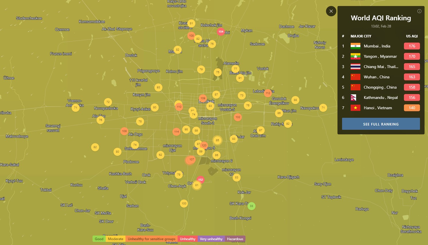 В рейтинге крупнейших городов мира по качеству воздуха World Air Quality Бишкек опустился на 26-е место.