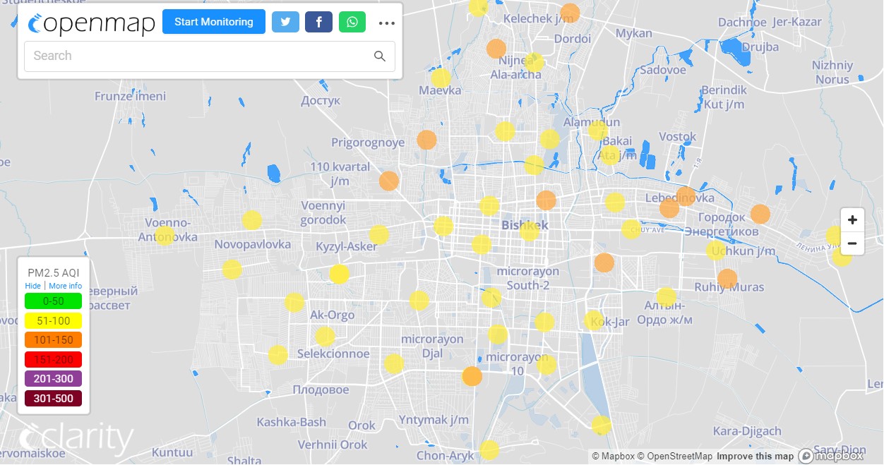 Посольство США в Кыргызстане также установило станцию. Информация обновляется каждый час. Индекс качества воздуха в районе дипломатической миссии «нездоровый для чувствительных групп» — 113 (AQI).