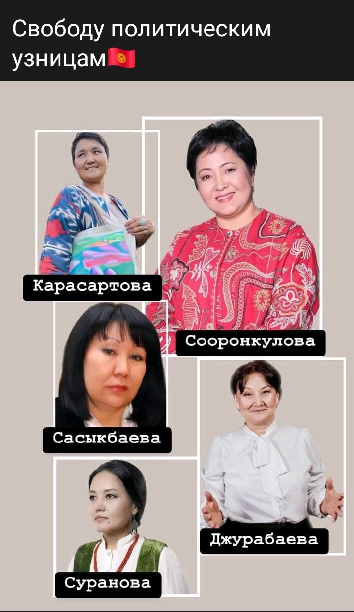 Ассоциация адвокатов Кыргызстана поздравила находящихся под арестом по обвинению в попытке организации массовых беспорядков с целью захвата власти Клару Сооронкулову, Гульнару Джурабаеву, Асию Сасыкбаеву, Перизат Суранову и Риту Карасартову.