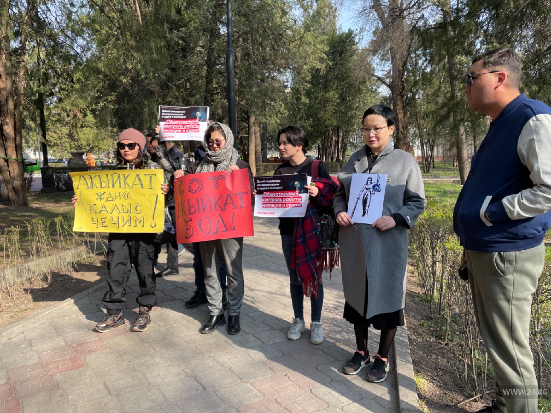 Они держат плакаты: «Суд, будь справедливым», «Акыйкат чечим». Собравшиеся и родные ребенка опасаются, что виновные могут уйти от наказания. Правоохранительные органы попросили участников отойти вглубь сквера напротив Верховного суда.