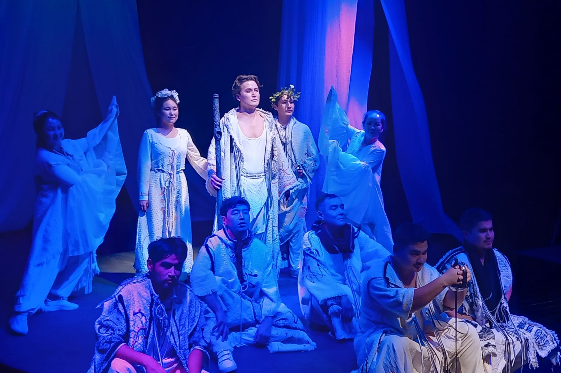 «Буря» — самая фантастическая пьеса Шекспира, где герои переживают невероятные приключения на волшебном острове, находят любовь, мстят обидчикам и получают свободу. Живую магию создала группа постановщиков: автор инсценировки и режиссер — народный артист Республики Казахстан Бекпулат Парманов, сценограф и художник по костюмам Зухра Мукамбетова, пластика — заслуженный деятель культуры КР Сергей Стрельцов, видеоряд и музыкальное оформление — Азамат Турусбек уулу.