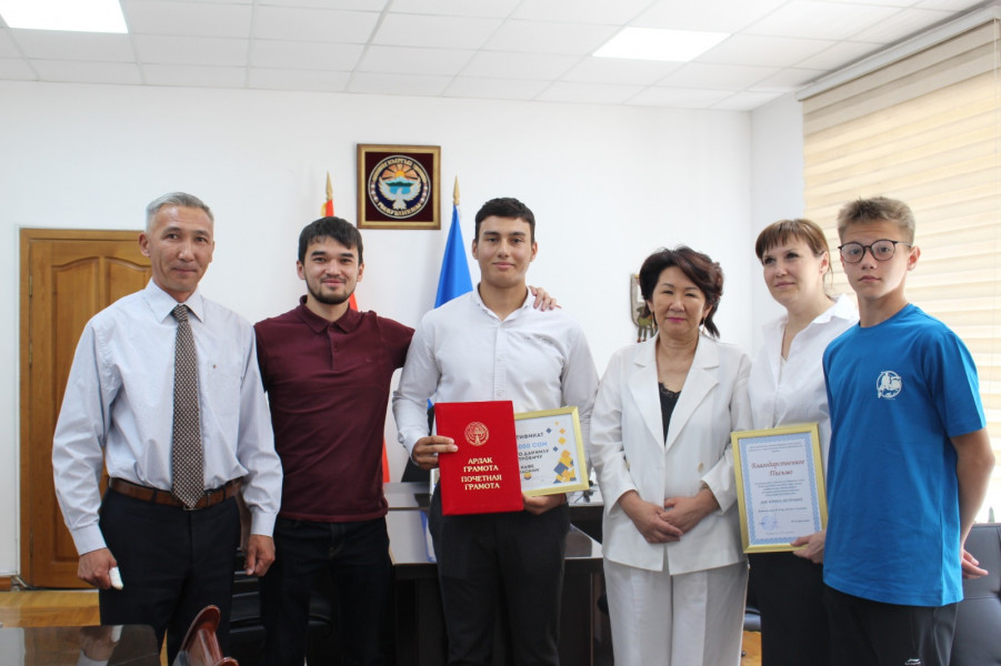 Фото пресс-службы мэрии Бишкека. В Бишкеке наградили школьника за спасение двоих детей, тонувших в БЧК