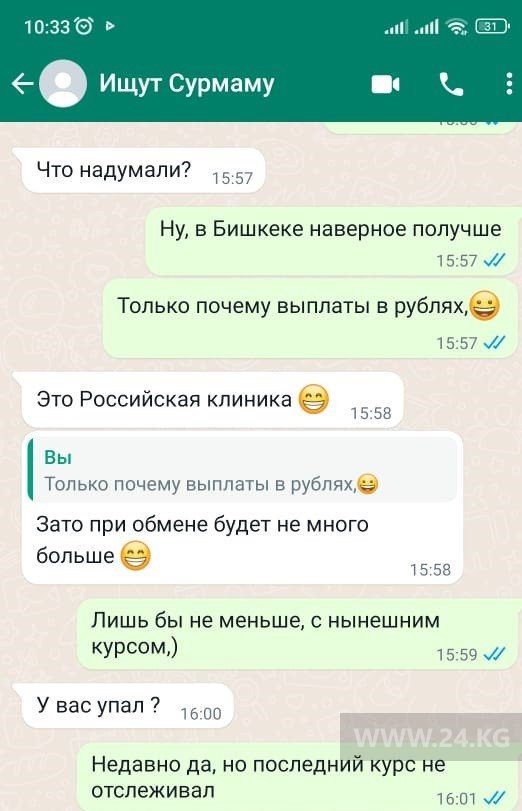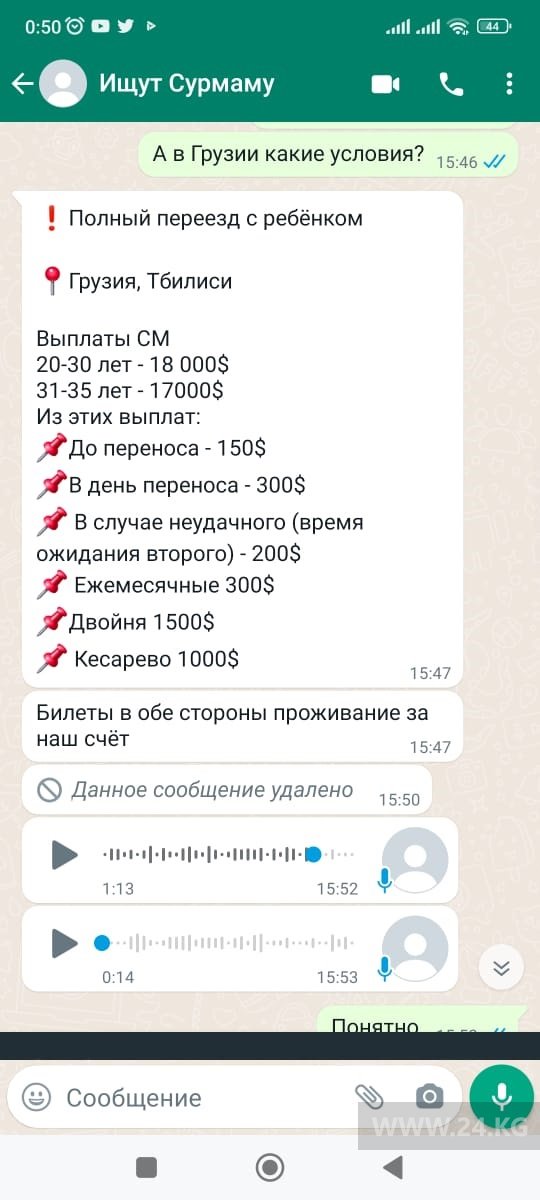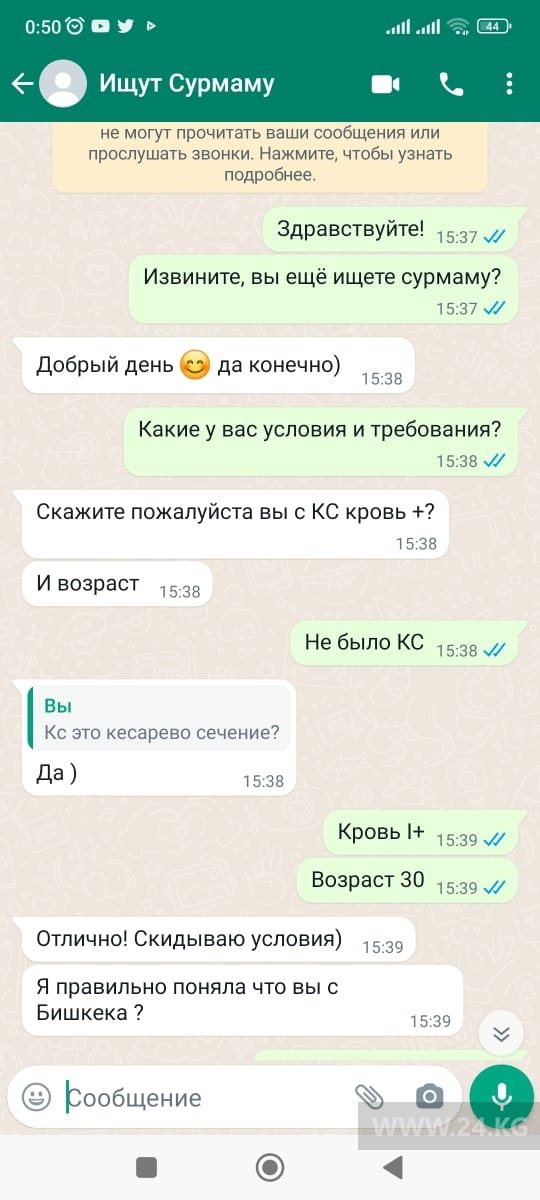 На том же сайте мы наткнулись на контакты женщины из Бишкека, готовой «подарить другим счастье материнства». Она также оказалась словоохотливой и рассказала о своем опыте. Ей 33 года, есть свои дети, в программе участвует уже третий раз. С опытными, по ее словам, гонорар обсуждается отдельно. Сумму женщина не назвала.Последний раз она собиралась участвовать в программе, предусматривающей поездку на Кипр. Подготовка проходит в Бишкеке, сурмаму сопровождает куратор, при необходимости предоставляется лечение, а на подсадку отправляют на два-три дня на Кипр. На 28-й неделе придется вернуться туда снова вплоть до срока родов. Гонорар после родов составляет $14,3 тысячи, за многоплодную беременность — $16,3 тысячи. Предусмотрены также ежемесячные выплаты по $300.
