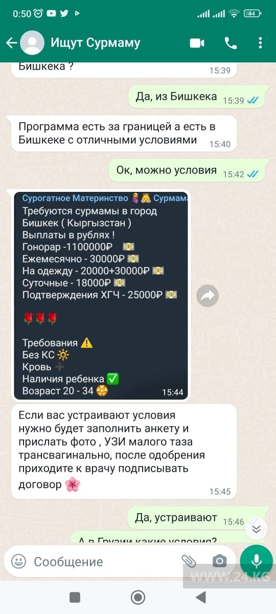 В интернете есть немало сайтов, где публикуются объявления как о поиске желающих выносить чужого ребенка, так и предложения самих кандидаток.Корреспондент 24.kg связалась по телефону с одной из клиник в Бишкеке, занимающейся подбором суррогатных матерей.