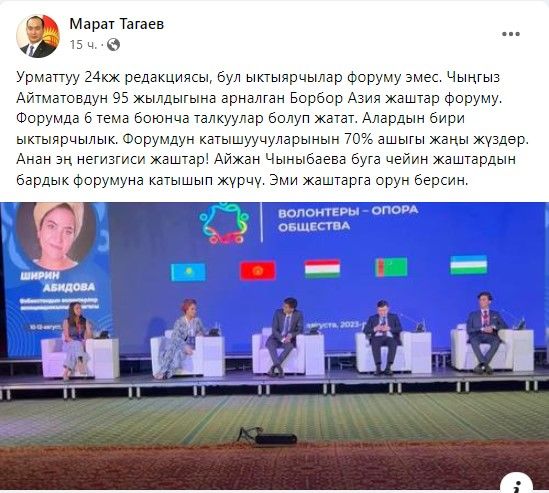«Здесь обсуждают шесть тем, одна из них волонтерство. Более 70 процентов участников — новые лица. Самое главное — молодежь. Айжан Чыныбаева до этого участвовала в молодежных форумах. Пусть теперь уступит дорогу молодым», — написал он.