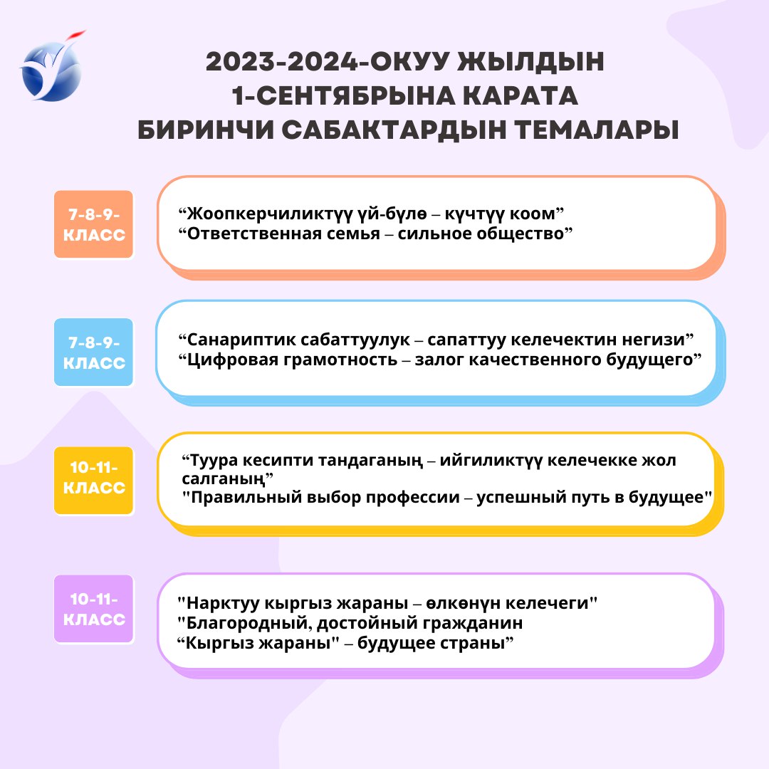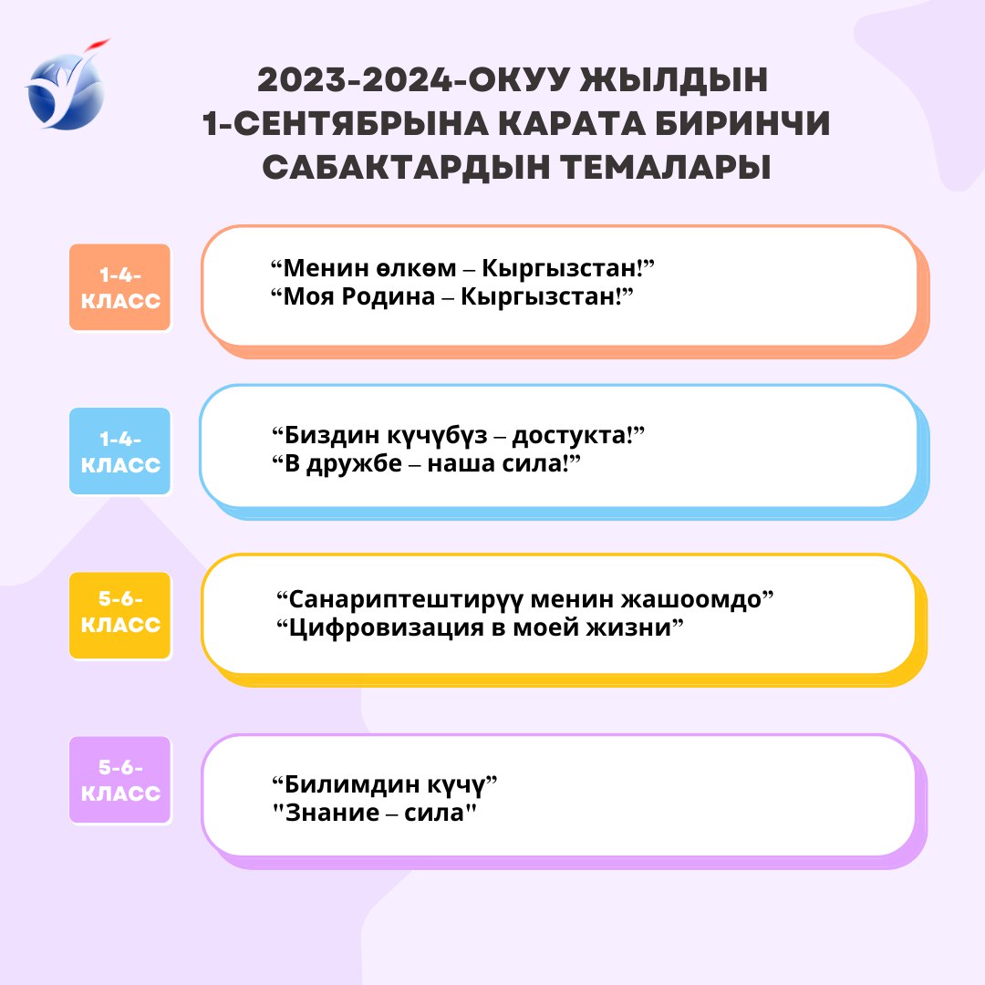 Так, для учеников 1-4-х классов решено провести уроки «Моя Родина — Кыргызстан» или «В дружбе наша сила». Учащимся 5-6-х классов расскажут про цифровизацию и про то, что «Знание — сила».