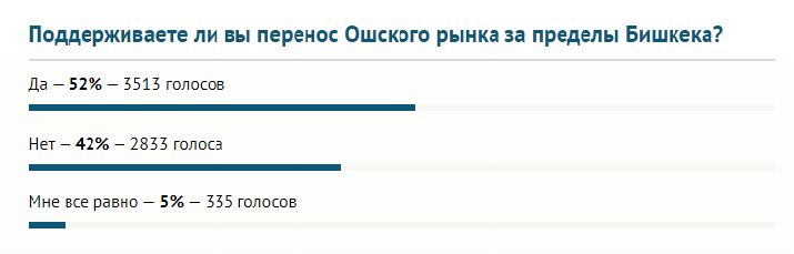 В поддержку инициативы градоначальника Эмилбека Абдыкадырова высказались более 3,5 тысячи респондентов. Против — более 2,8 тысячи голосов. Еще 5 процентов проголосовавших признались, что им все равно.