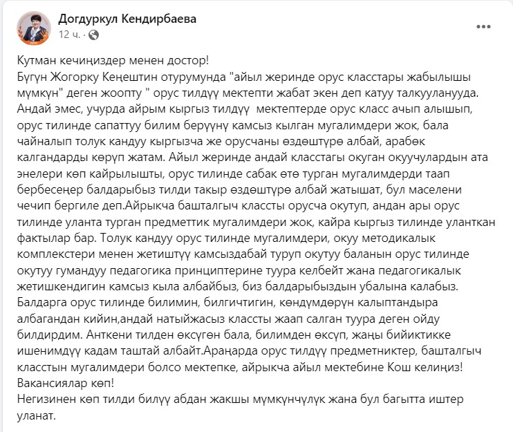 «Это не так. В некоторых кыргызскоязычных школах открыли классы с русским языком обучения, но учителей, которые бы давали качественное образование на русском языке, нет. В результате ребенок не может освоить полноценно ни кыргызский, ни русский языки. Родители обращались к нам с просьбой решить эту проблему. Есть факты, когда нет русскоговорящих учителей-предметников и дети продолжают учиться на кыргызском языке. Преподавание на русском языке при отсутствии русскоязычных учителей и учебно-методических комплексов не соответствует принципам гуманной педагогики, мы не можем обеспечить педагогический успех. Я высказала мнение, что правильнее закрывать такой неэффективный класс. Потому что ребенок, которому не хватает языка, не хватает знаний, не может сделать уверенный шаг к новым вершинам», — написала она и пригласила русскоязычных учителей работать в школы.
