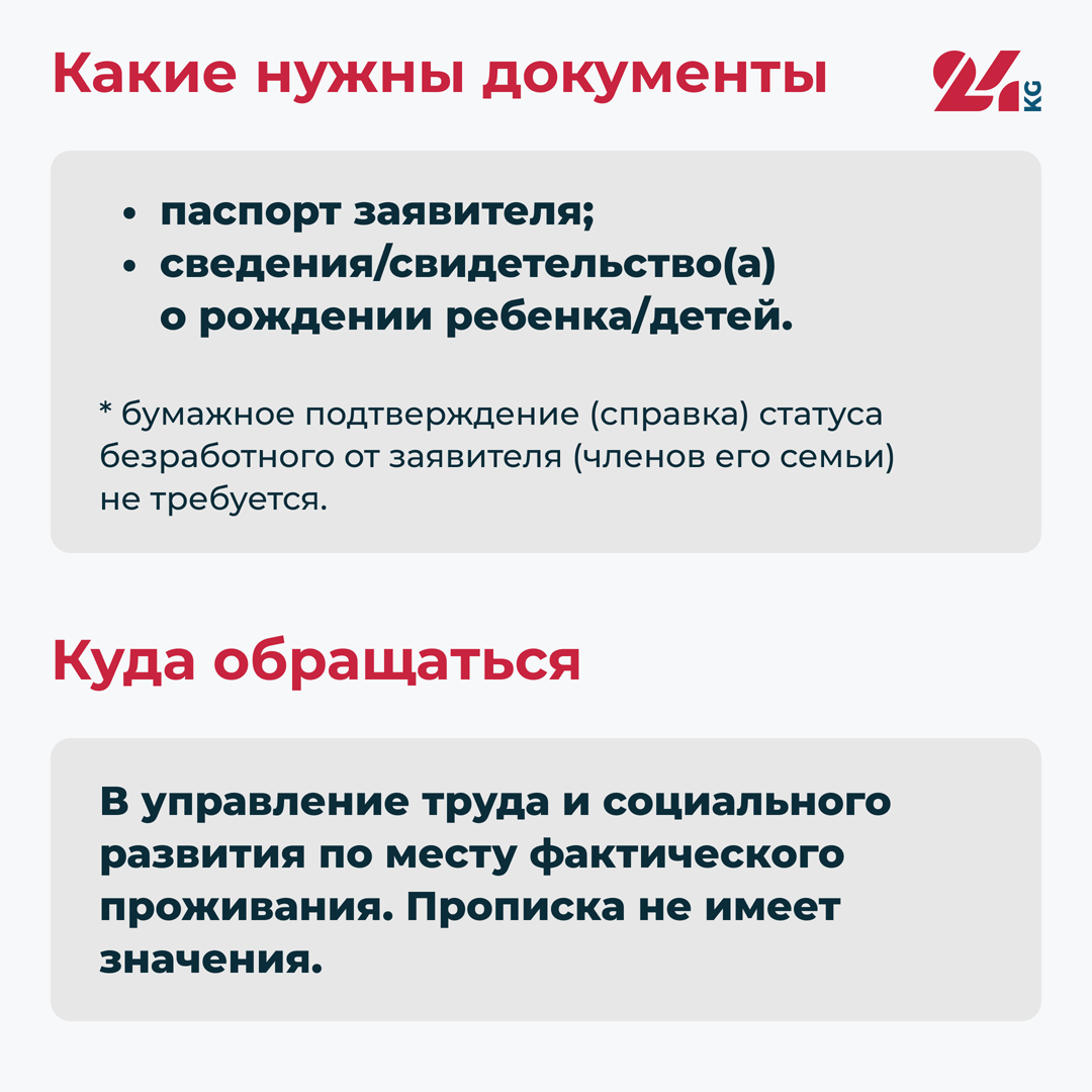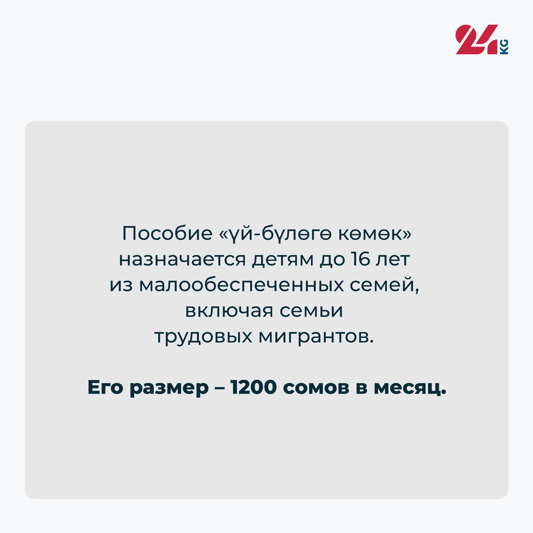 Пособие «үй-бүлөгө көмөк» назначается детям до 16 лет из малообеспеченных семей, включая семьи трудовых мигрантов. Его размер — 1,2 тысячи в месяц.
