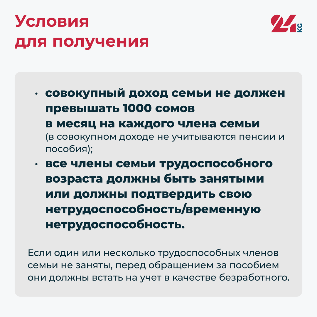 - совокупный доход семьи не должен превышать 1 тысячу сомов в месяц на каждого члена семьи (в совокупном доходе не учитываются пенсии и пособия);