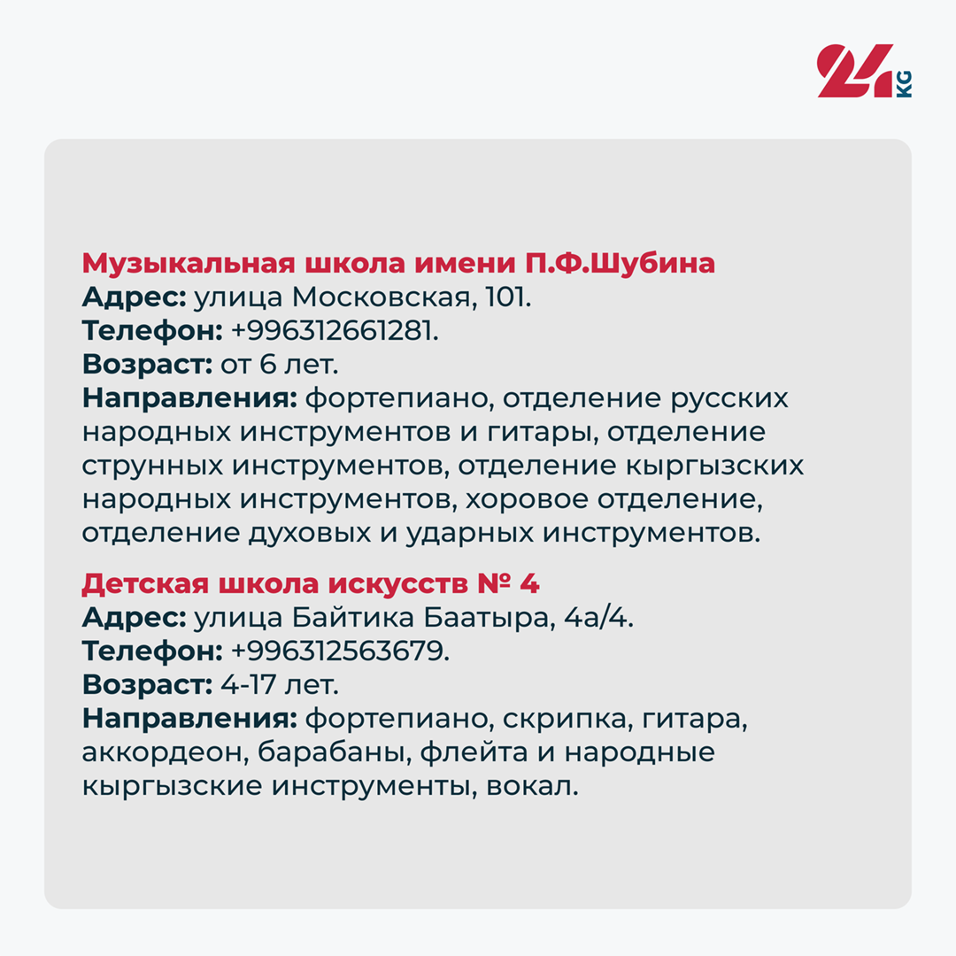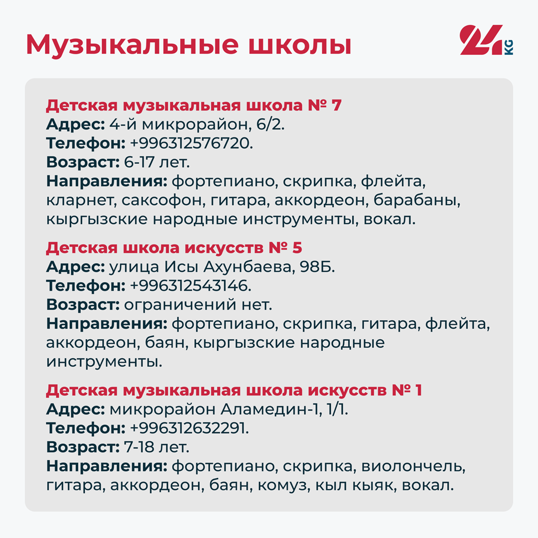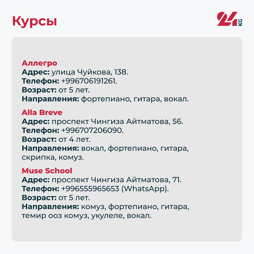 Редакция 24.kg собрала адреса и телефоны специализированных школ, где детей могут научить играть на различных инструментах.