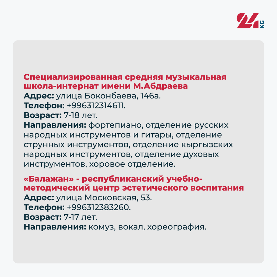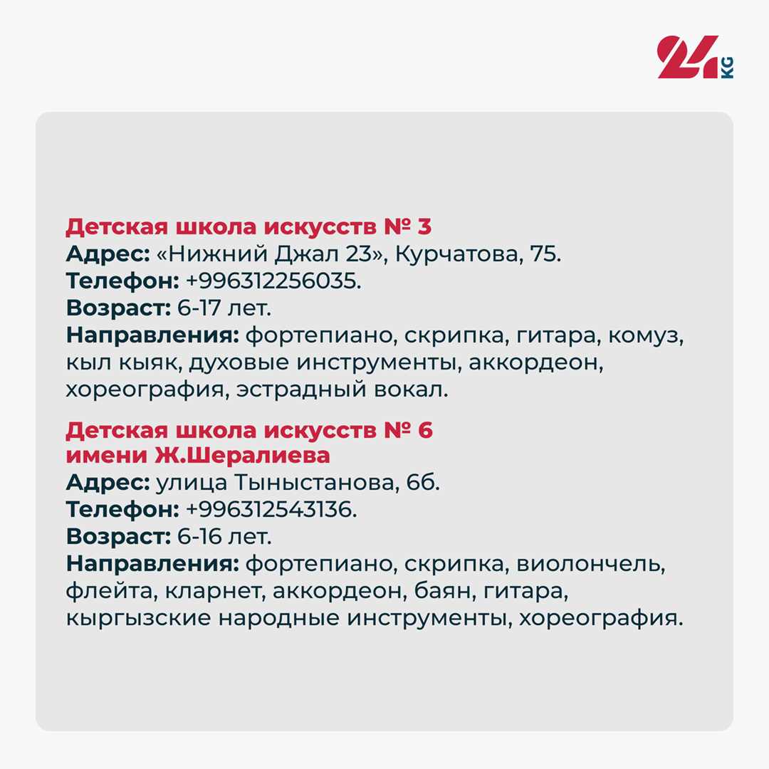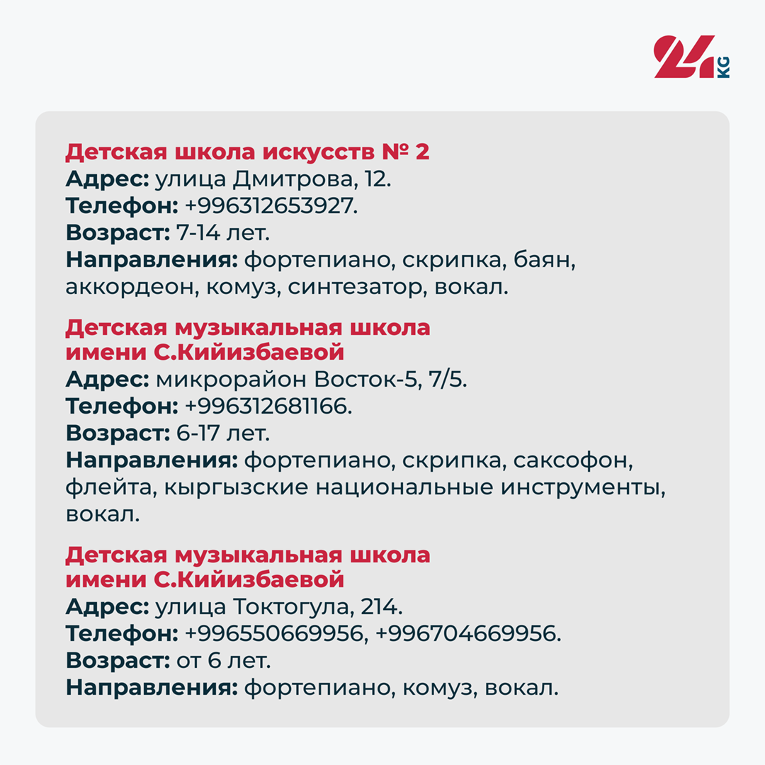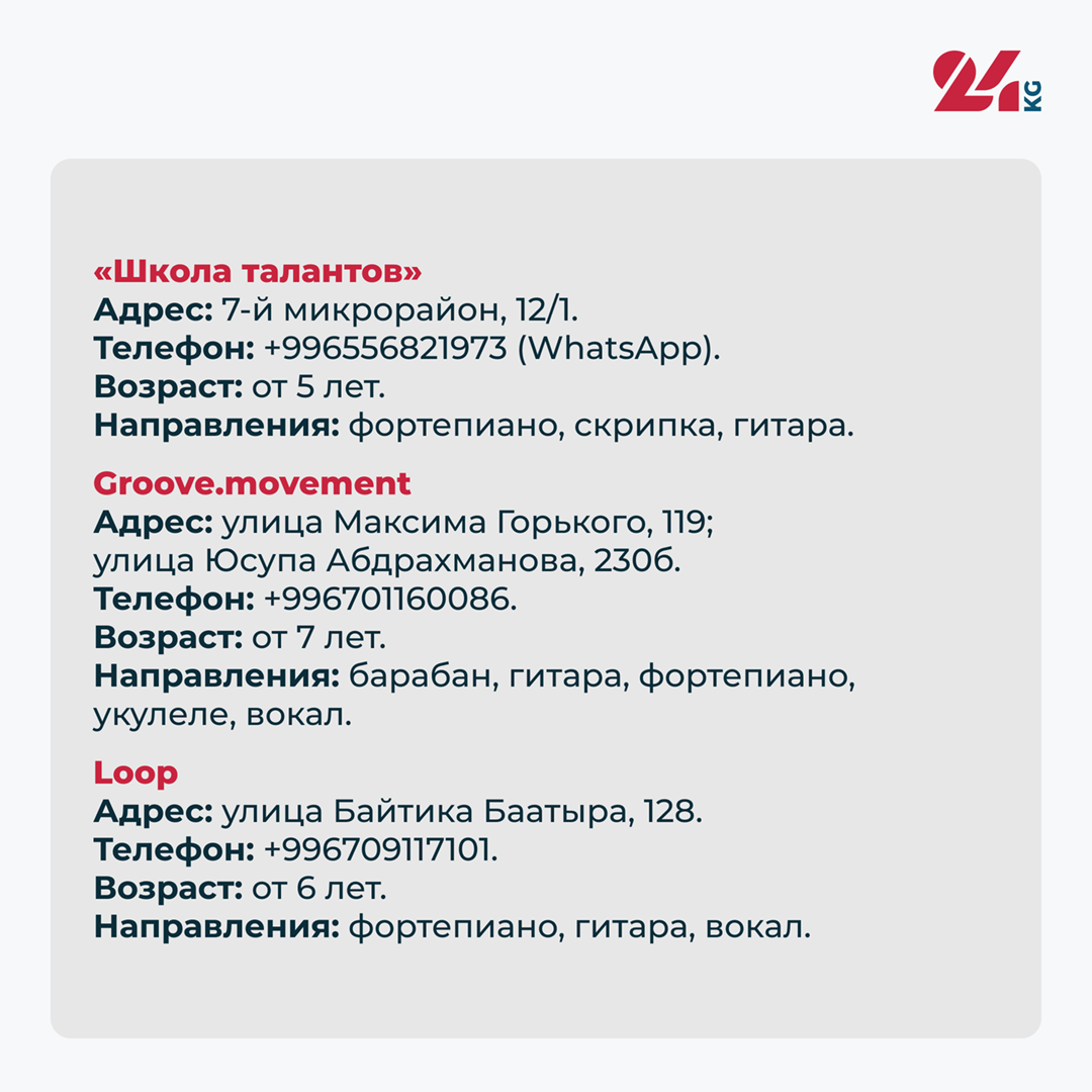 Редакция 24.kg собрала адреса и телефоны специализированных школ, где детей могут научить играть на различных инструментах.