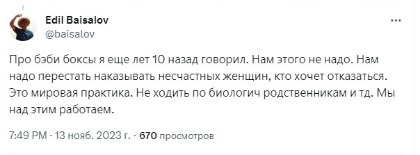 Кыргызстану не нужны беби-боксы. Об этом в соцсети X (Twitter) написал заместитель председателя кабмина Эдиль Байсалов.