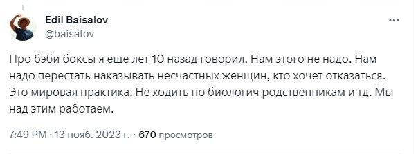 «Про беби-боксы я еще лет десять назад говорил. Нам этого не надо. Нам надо перестать наказывать несчастных женщин, кто хочет отказаться. Это мировая практика. Не ходить по биологическим родственникам и так далее. Мы над этим работаем», — отметил он.
