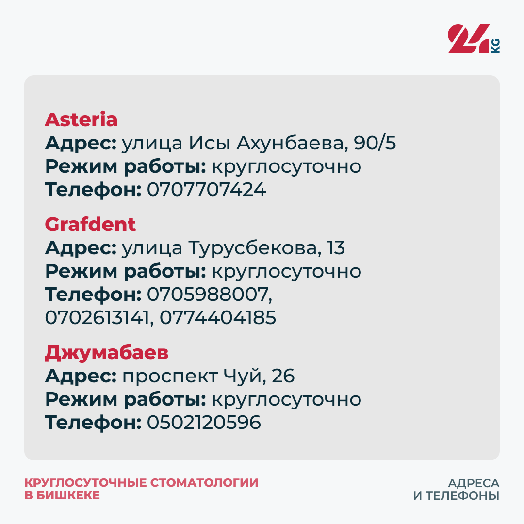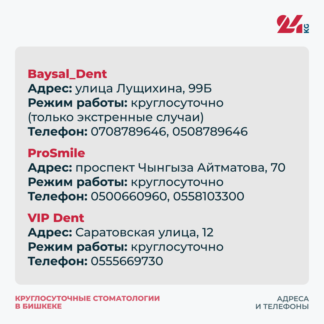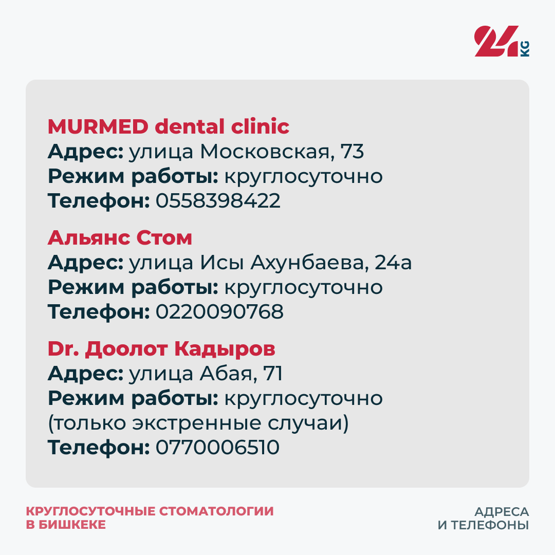 Редакция 24-kg.com собрала адреса и телефоны стоматологических клиник, в которых оказывают помощь круглосуточно.
