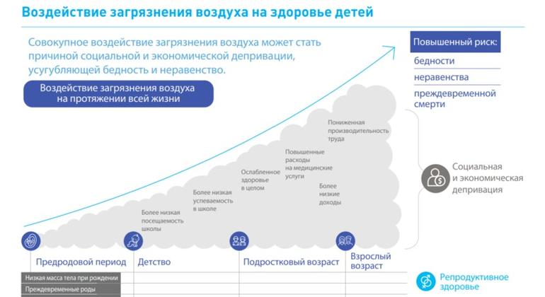 Дети физиологически более уязвимы к загрязнению воздуха, чем взрослые, поскольку их мозг, легкие и другие органы еще не достигли достаточного уровня развития и механизмы защиты от воздействия токсичных загрязнителей не работают, как у взрослых. Длительное воздействие токсичных загрязняющих веществ ведет к нарушению роста и развития их органов, влияет на развитие мозга в важнейшие ранние годы жизни, что приводит к долгосрочным последствиям для физического и умственного развития.