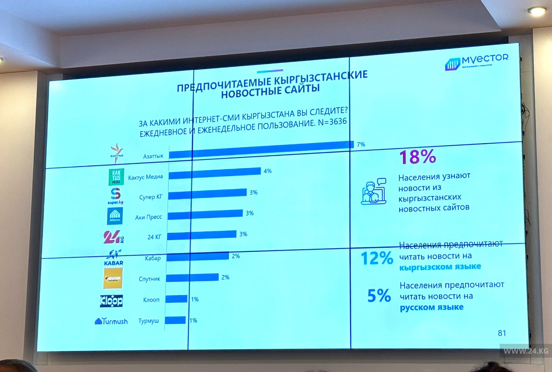 На первом месте респонденты назвали «Азаттык». Также в топ вошли Kaktus.media, Super.kg и AКИpress.
