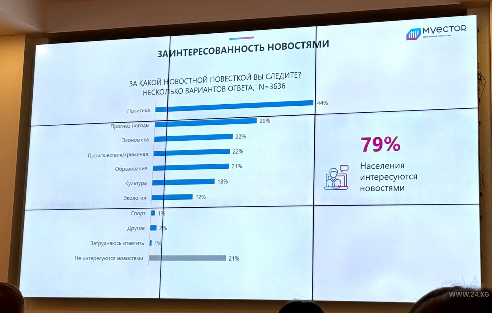 Самыми популярными остаются новости политики, ими интересуются 44 процента опрошенных. На втором месте — прогноз погоды. В топе также новости экономики, криминальная хроника и образование.