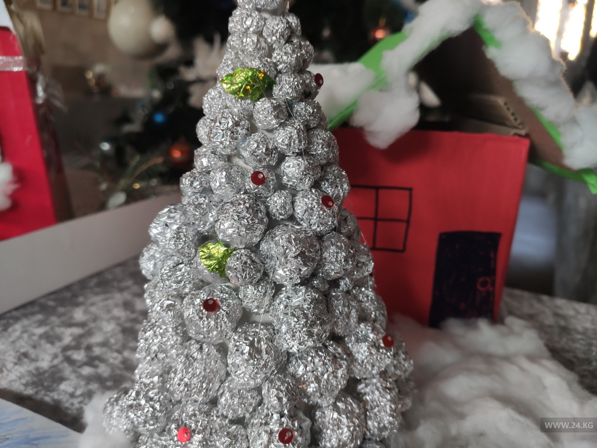 Еще варианты — сделать елку из войлока или фольги. Последний вариант довольно простой. Нужно скатать шарики разного диаметра и приклеить на готовую основу. Украсить можно по желанию.