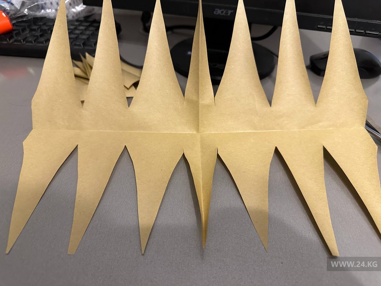 По тому же принципу сделали снежинки из упаковочной бумаги. Она более прочная. При желании можно сделать несколько таких, соединить между собой — и получится гирлянда.