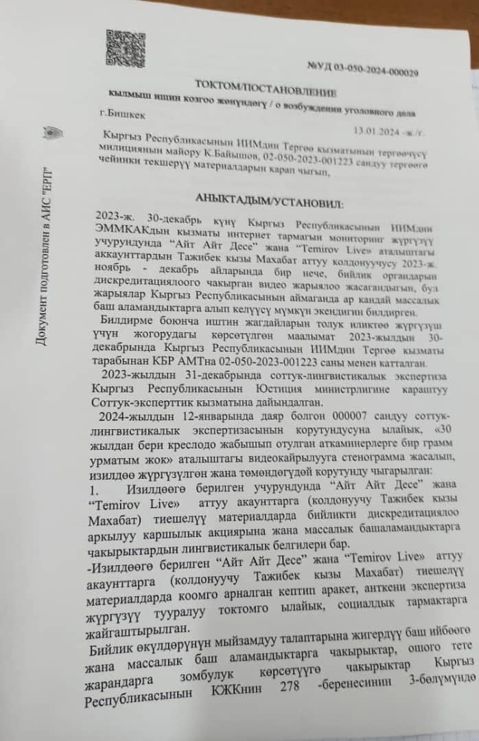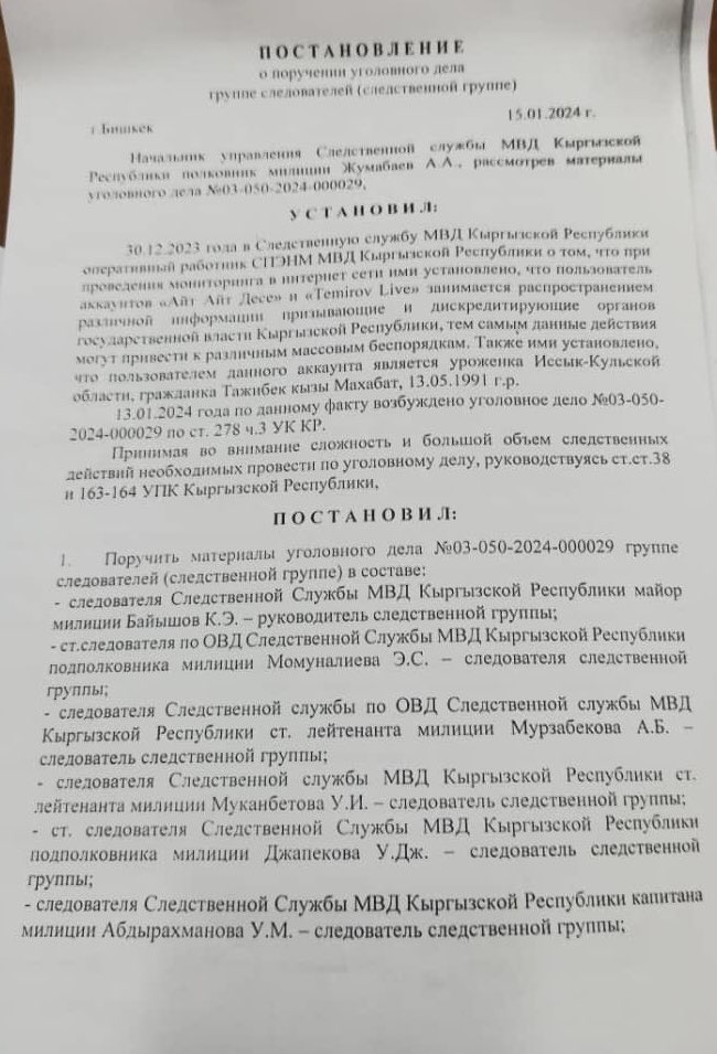 В постановлении о возбуждении уголовного дела говорится, что аккаунты «Айт Айт Десе» и Temirov Live в ноябре и декабре прошлого года в социальных сетях распространяли информацию, дискредитирующую государственные органы. Следствие считает, что эти действия могут привести к различным массовым беспорядкам. По данным следствия, пользователем этих аккаунтов является Махабат Тажибек кызы (жена Болота Темирова. — Прим. 24.kg).
