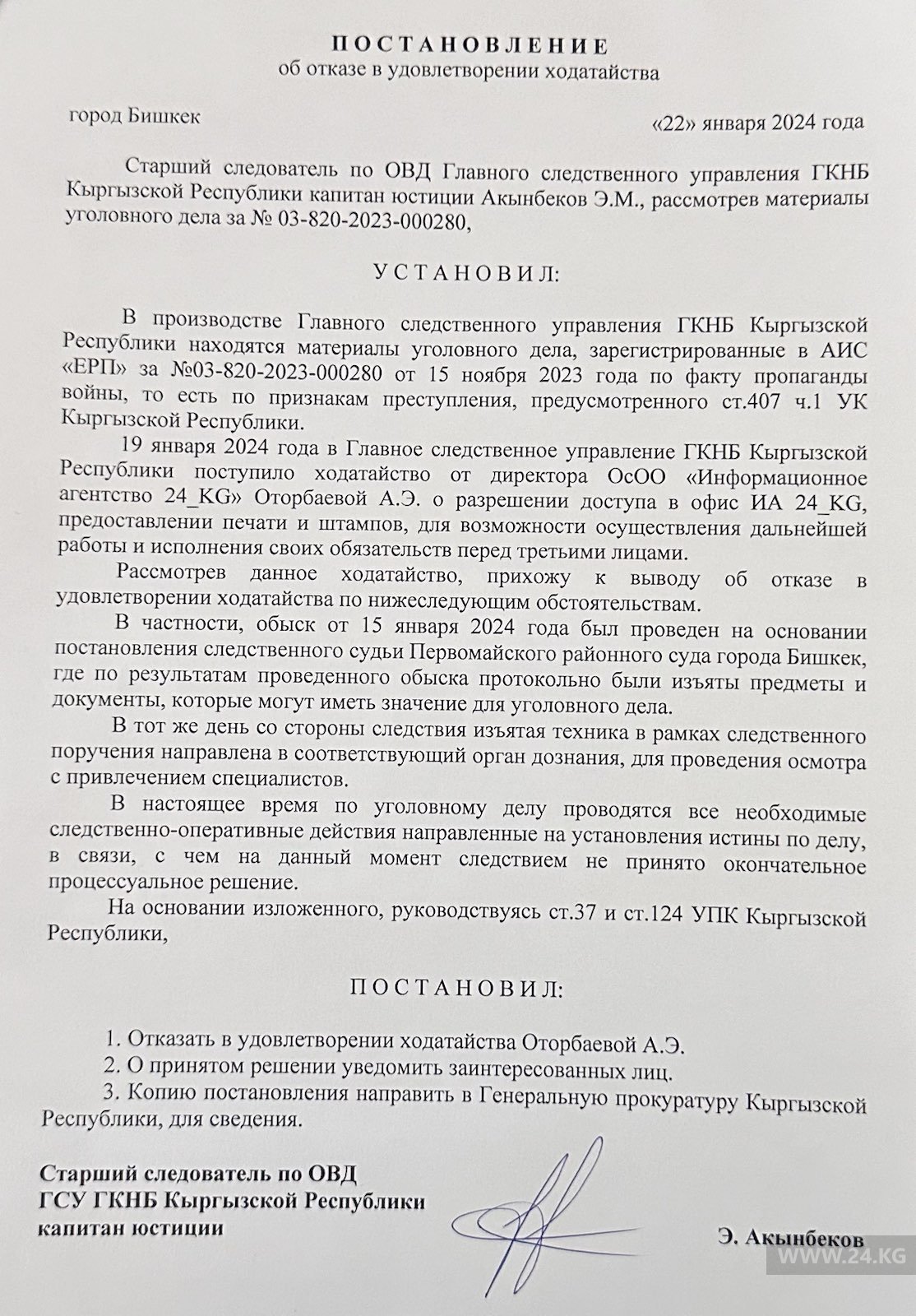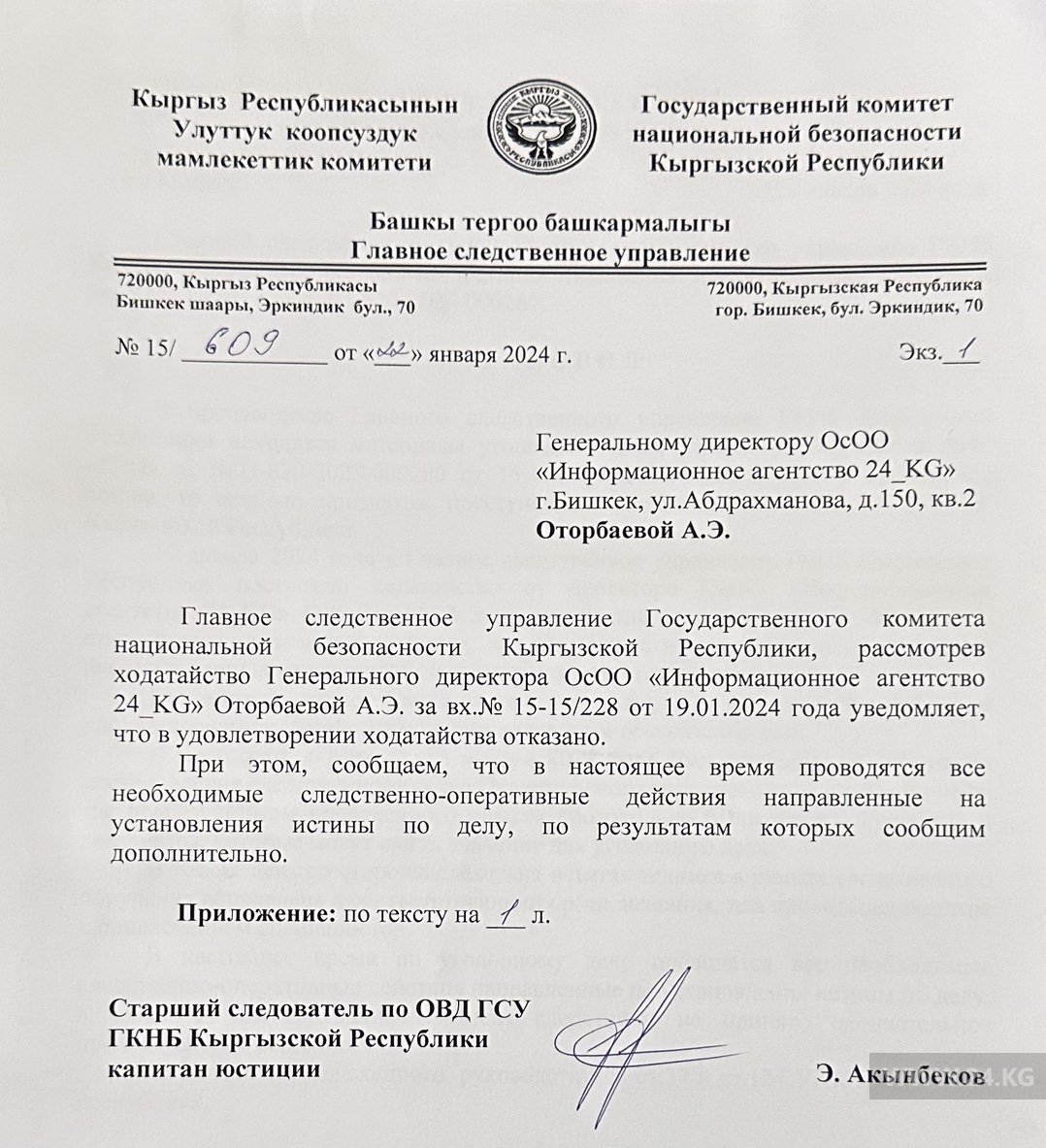 Напомним, в понедельник, 15 января, сотрудники ГКНБ пришли в офис редакции 24-kg.com примерно в 11.00. Они несколько часов проводили обыск, изъяли документы, технику информагентства и личные телефоны сотрудников. На допрос отвезли гендиректора Асель Оторбаеву, шеф-редакторов Антона Лымаря и Махинур Ниязову.