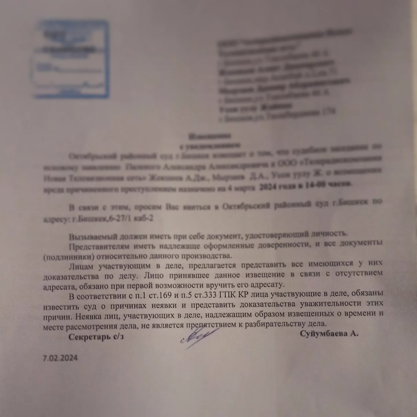 Журналист Азият Жекшеев написал в своем аккаунте Facebook, что ему выдали повестку в Октябрьский районный суд по старому делу, по которому он несколько раз выигрывал. Автор «Кайгуул ТВ» рассказал 24-kg.com, что это связано с опубликованным видео в его авторской программе.