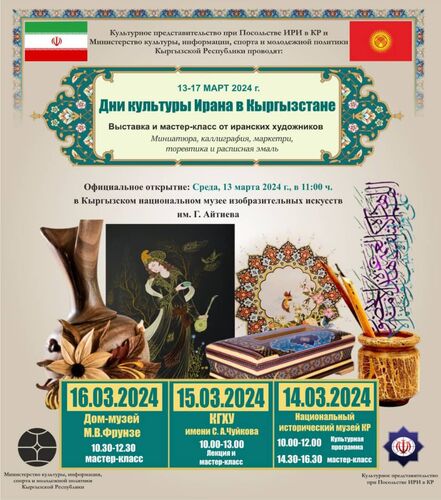 Расписание мастер-классов будет опубликовано на официальных страницах в социальных сетях культурного представительства при посольстве ИРИ в Кыргызстане.