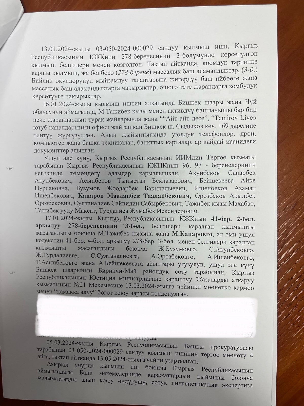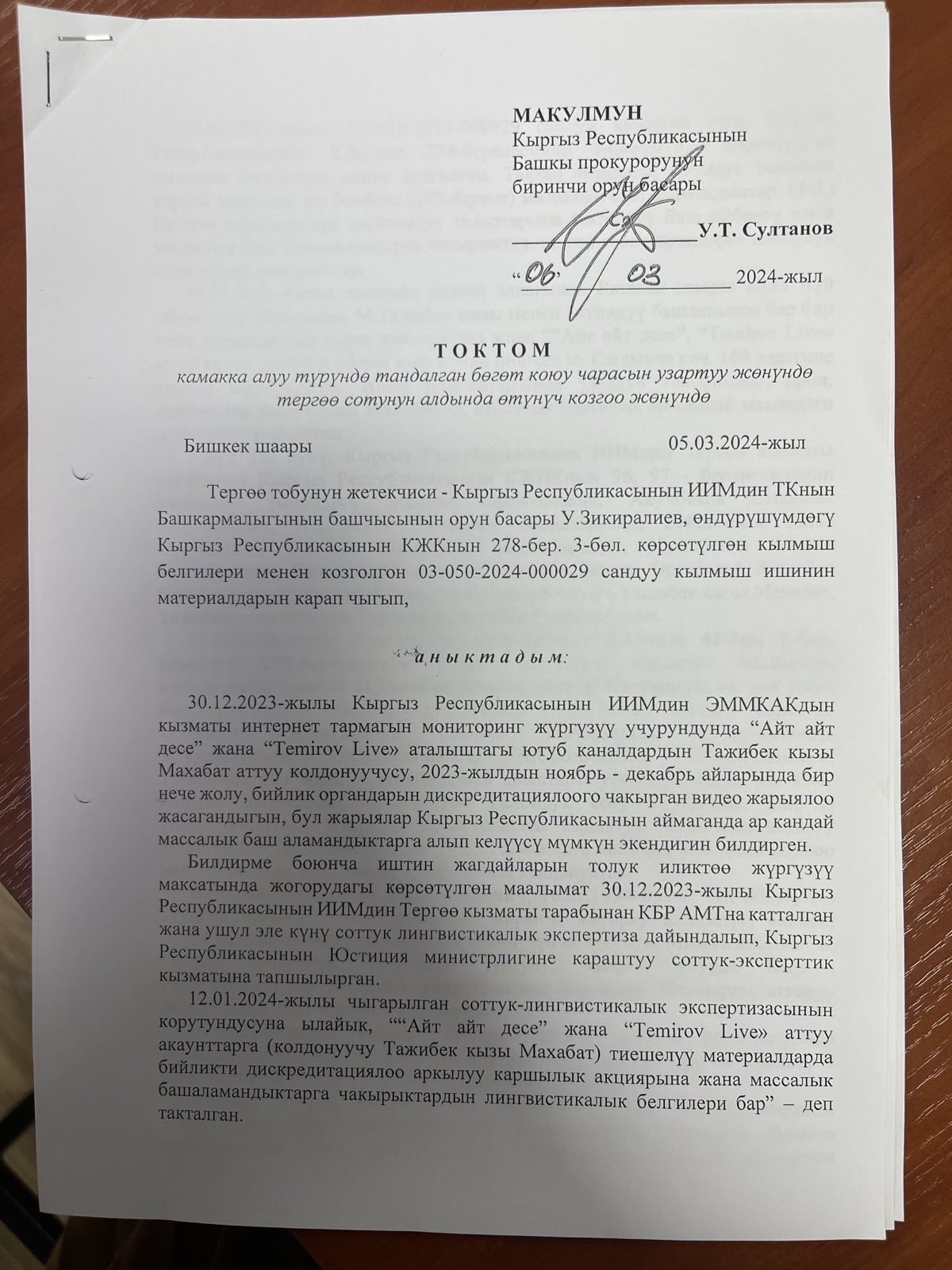 В МВД заявили, что по итогам «судебно-лингвистической экспертизы» контента на страницах Temirov Live и «Айт Айт Десе» в социальных сетях 30 декабря 2023 года возбуждено уголовное дело по статье 278 «Призывы к массовым беспорядкам» УК КР.