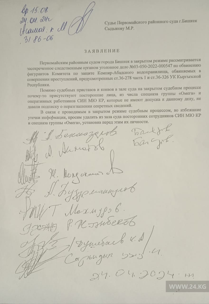 «Они были в форме и масках. Они относятся к департаменту конвоирования или нет? Поскольку дело засекречено и суд проходит в закрытом режиме, в целях соблюдения режима секретности и чтобы избежать утечки информации, обвиняемые просили удалить посторонних лиц, которые были в форме и масках», — сказал Эркин Саданбеков.