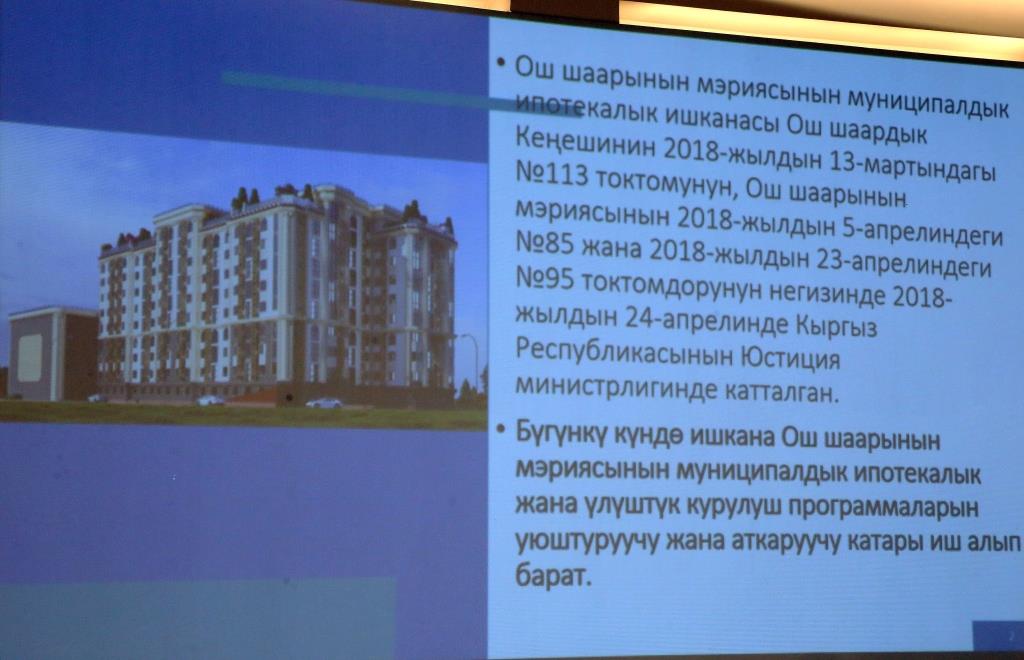 По ее данным, накануне по случаю шестилетия муниципальной ипотечной компании мэрии состоялась отчетная конференция. Ее руководитель Кутманалы Абдырахман уулу рассказал о проведенной предприятием работе и планах на будущее.