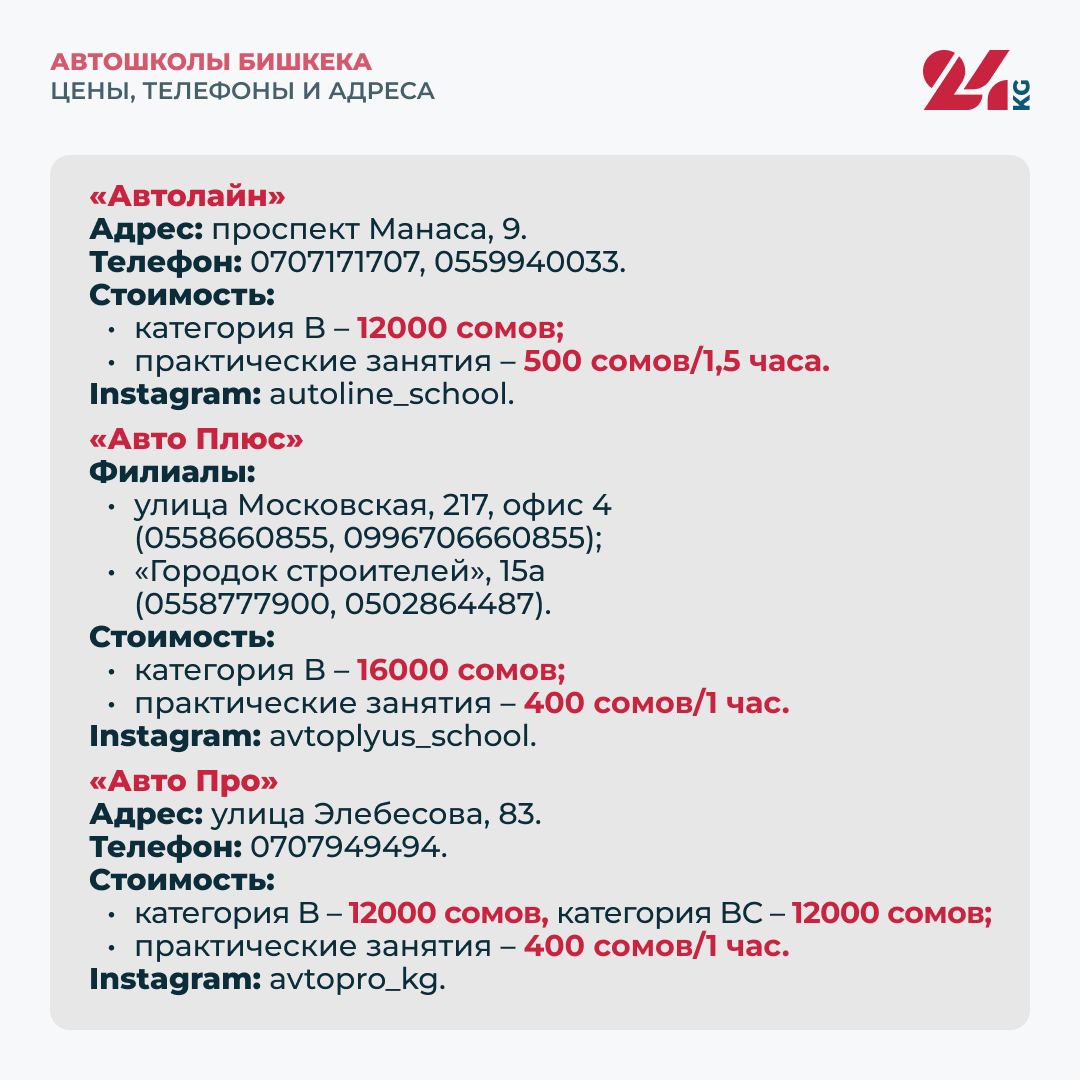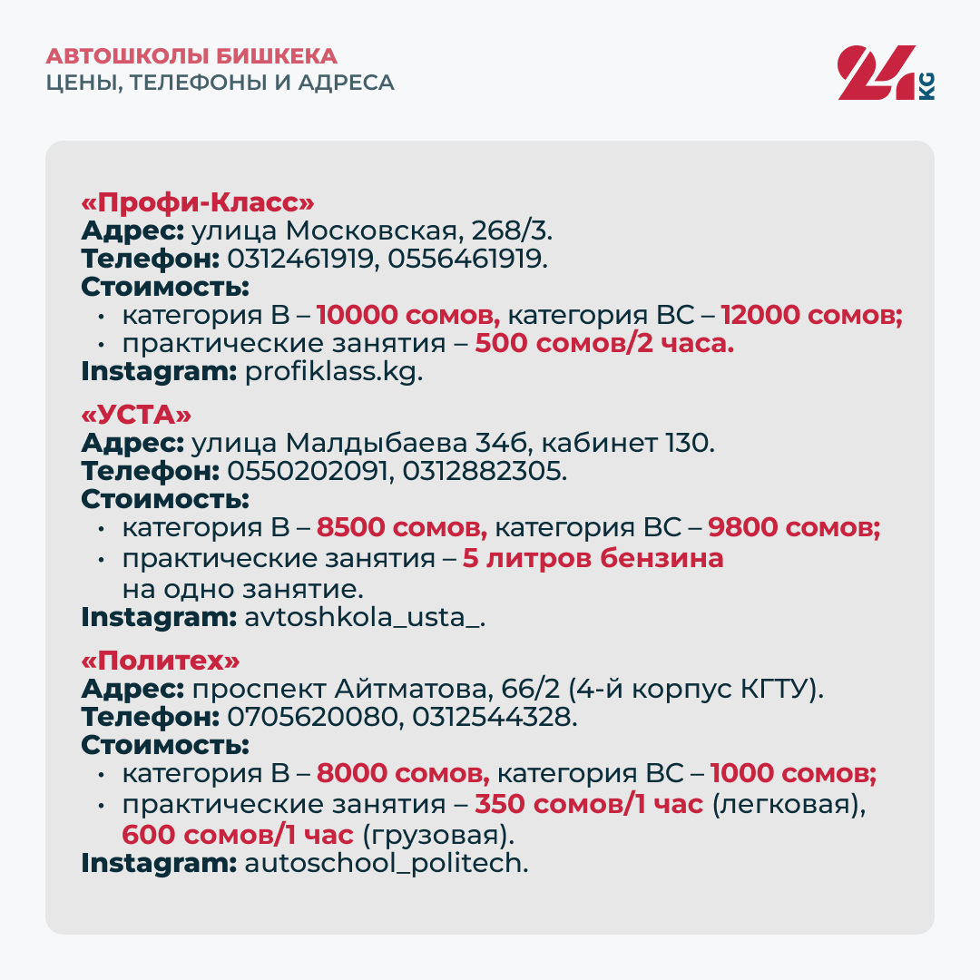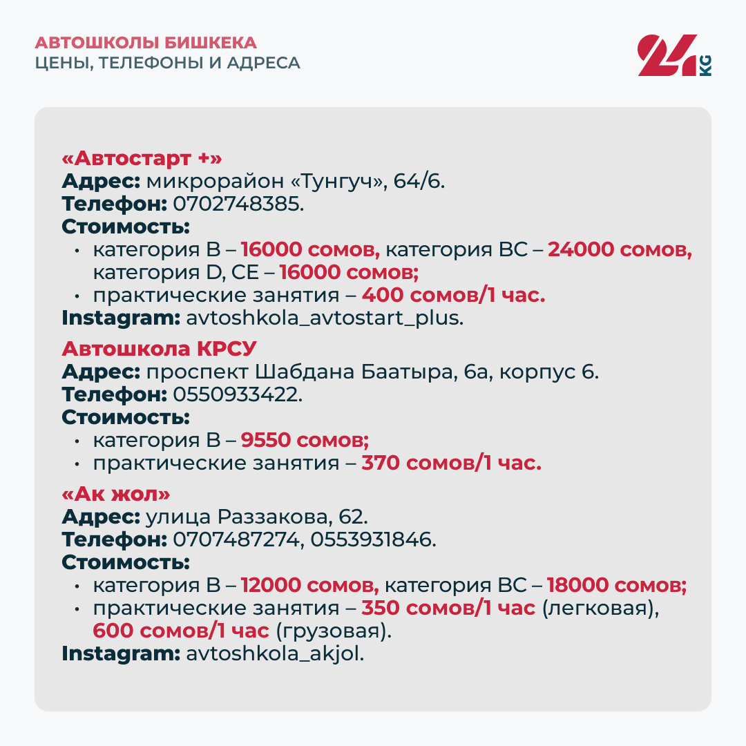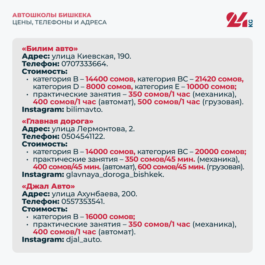 - практические занятия — 350 сомов/час (легковая), 450 сомов/час (грузовая).