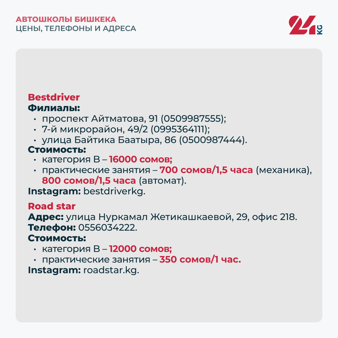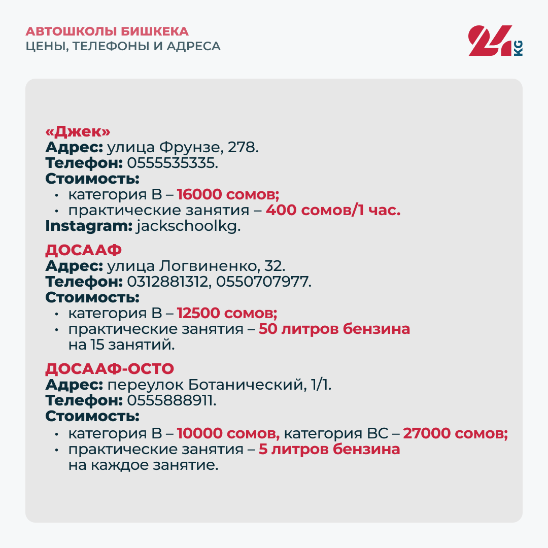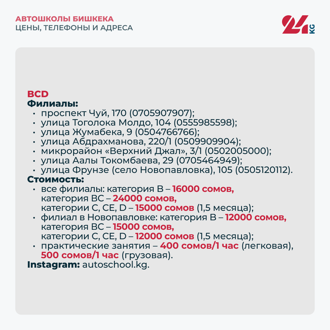 - филиал в Новопавловке: категория B — 12 тысяч сомов, категория ВС — 15 тысяч сомов, С, D, CE — 12 тысяч сомов (1,5 месяца);