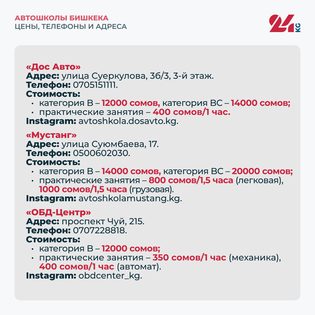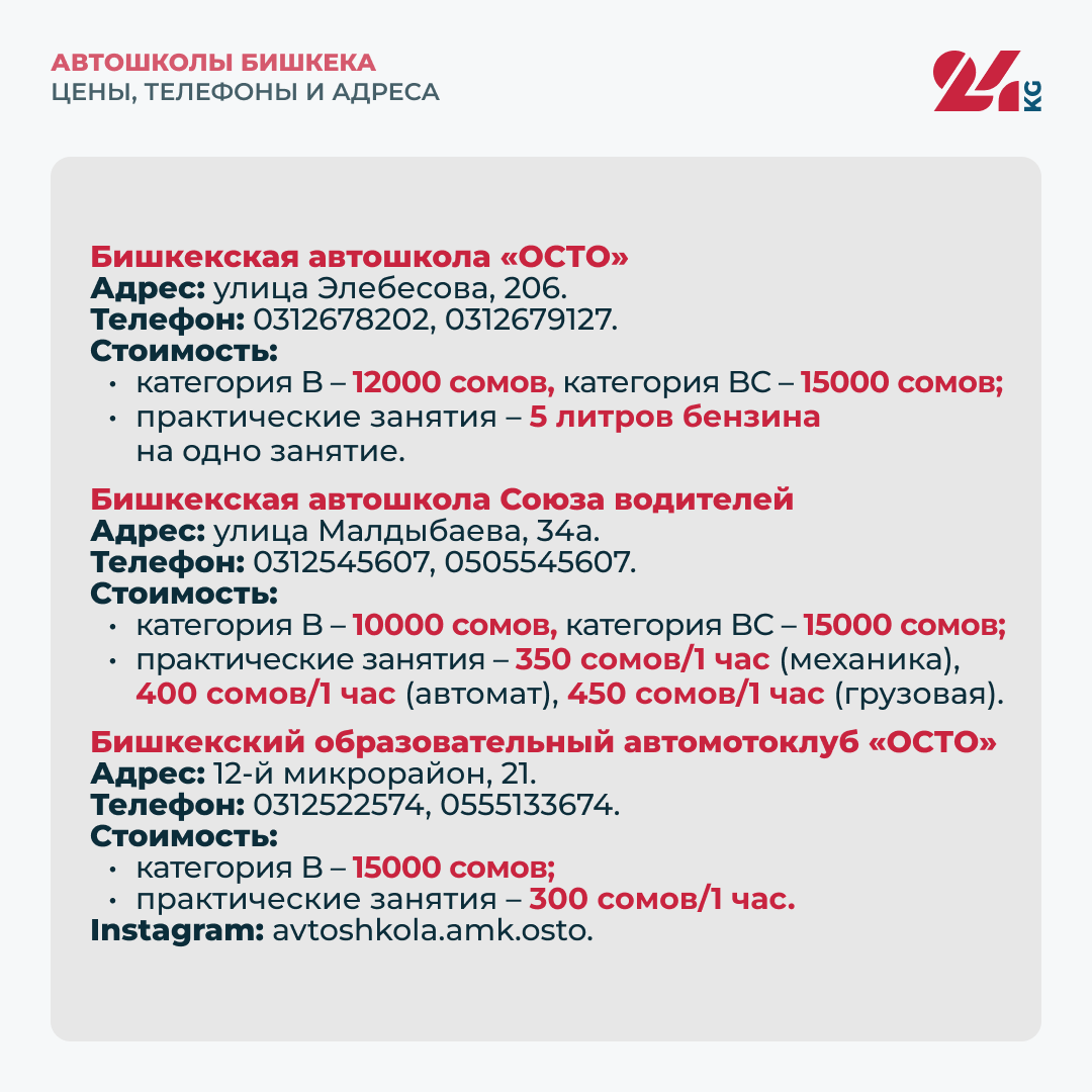 - практические занятия — 400 сомов/час (легковая), 500 сомов/час (грузовая).
