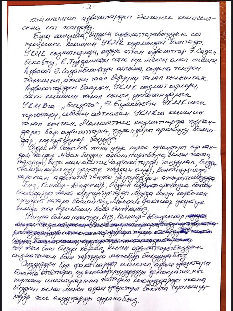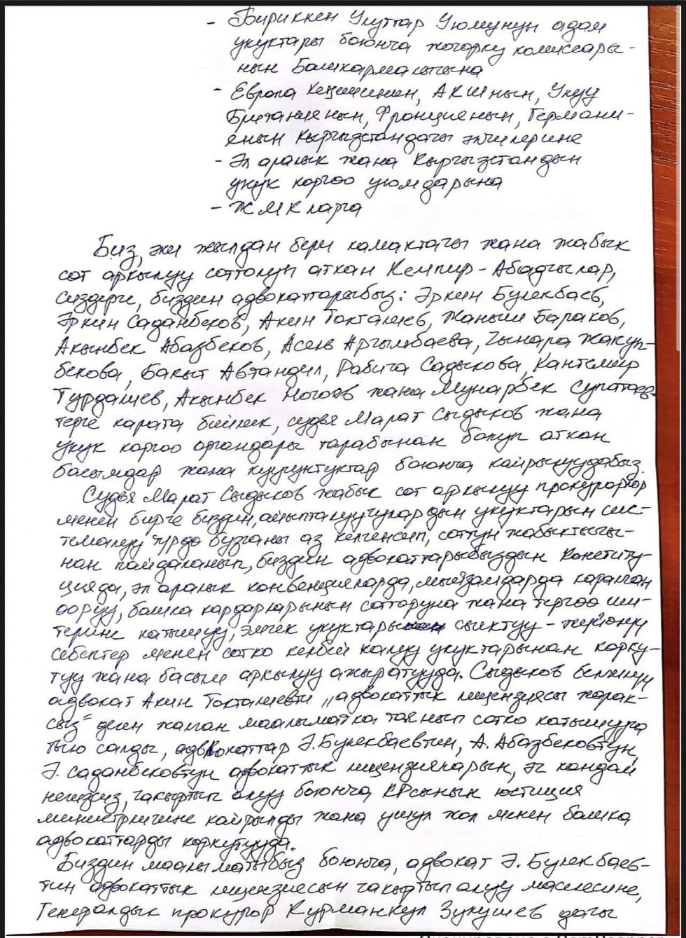 «Мало того, что судья Марат Сыдыков вместе с прокурорами систематически нарушает наши права, лишает права наших адвокатов на получение медицинского лечения, участвовать в других судебных заседаниях и следствиях, право на труд, которые предусмотрены Конституцией, международными конвенциями, их запугивают и давят за то, что они не могут прийти на судебные заседания по понятным причинам. Сыдыков запретил известному адвокату Акину Токталиеву участвовать в процессах. Этому послужила ложная информация о «недействительности его адвокатской лицензии». Также Марат Сыдыков обратился в Министерство юстиции с требованием о лишении лицензий адвокатов Булекбаева, Авазбекова и Саданбекова без каких-либо причин и так же запугивает других юристов», — говорится в обращении.