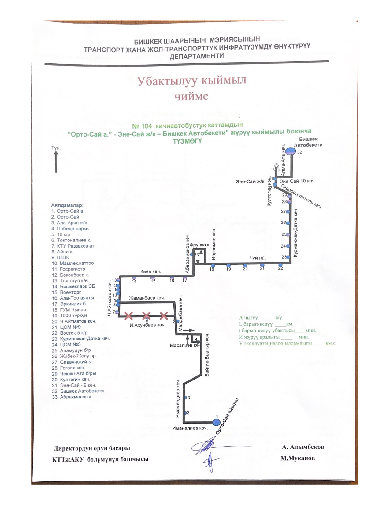 - № 104 — по улицам Малдыбаева и Жаманбаева;