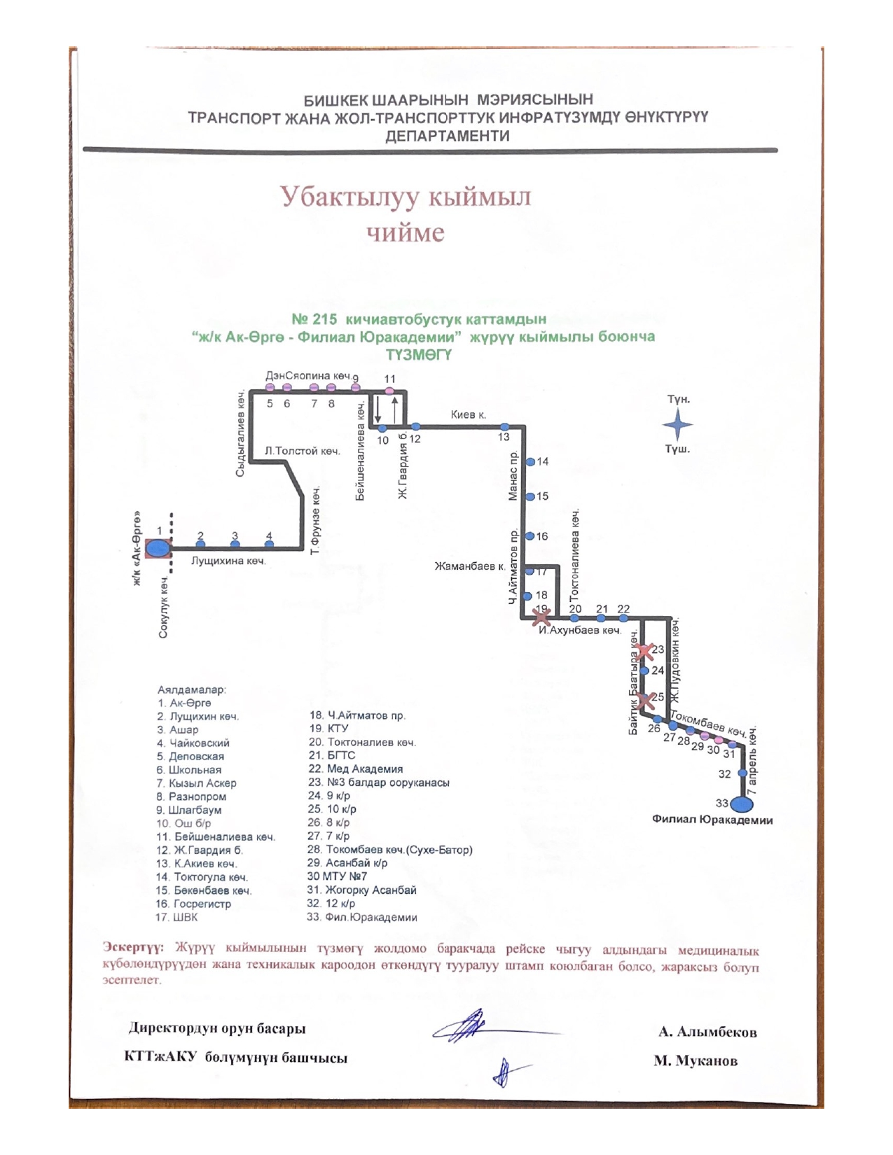 - № 215 — по улицам Токомбаева, Жукеева-Пудовкина, Ахунбаева, Токтоналиева и Айни.