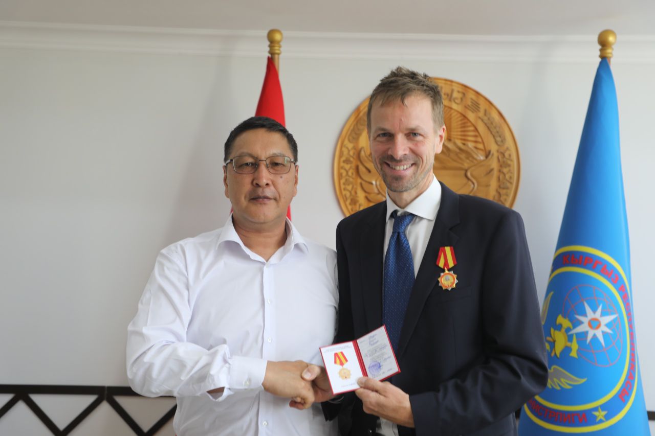 Бообек Ажикеев выразил главе миссии признательность за плодотворное и многолетнее партнерство, включая предоставленную помощь в деле предупреждения и ликвидации последствий, а также всестороннюю поддержку в повышении потенциала Министерства чрезвычайных ситуаций и наградил Штефана Гроссе Рюшкампа медалью МЧС «За укрепление военно-гражданского сотрудничества».