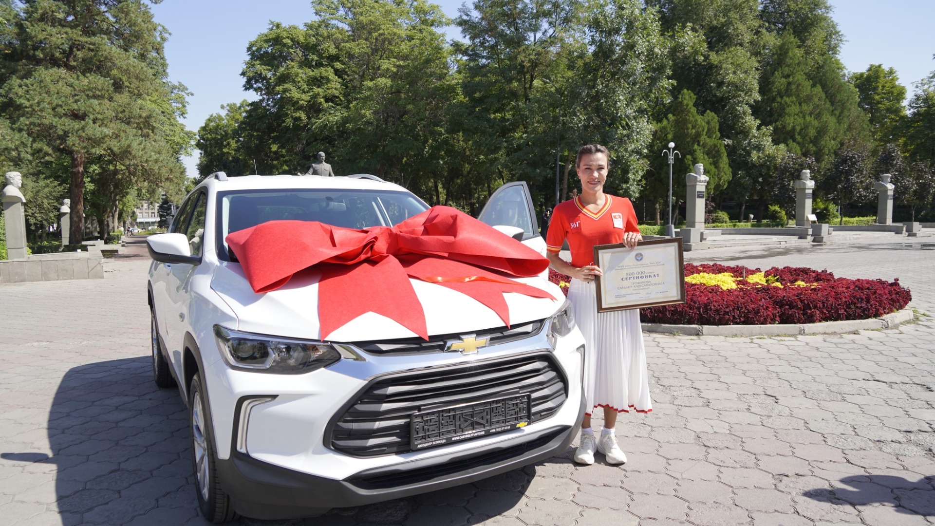 Легкоатлетка получила сертификат на 500 тысяч сомов и ключи от автомобиля Chevrolet Tracker.