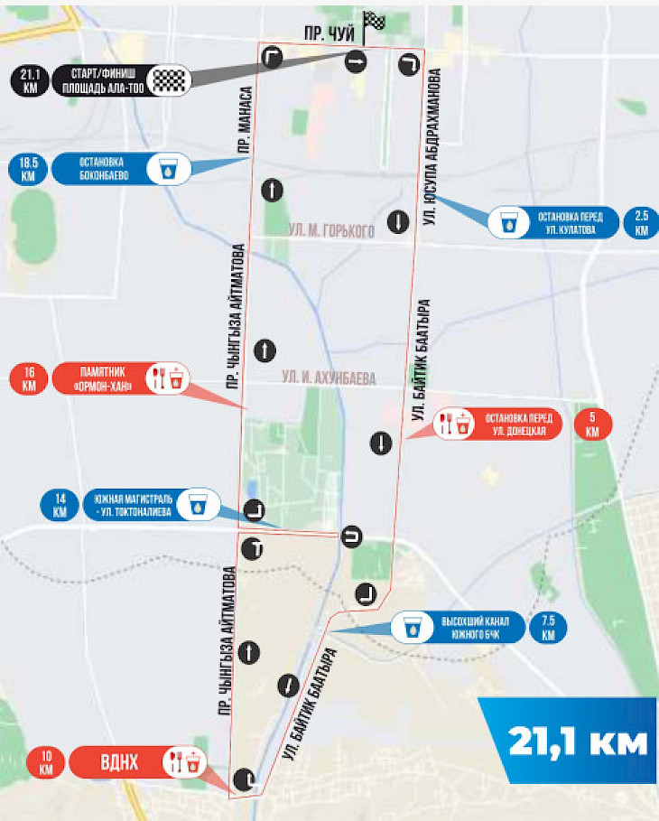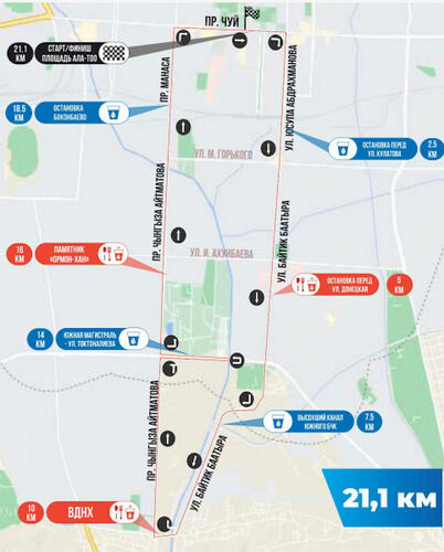 Марафон стартует с площади Ала-Тоо, а участники пробегут по центральным улицам города. В нем примут участие 4 тысячи 500 человек.