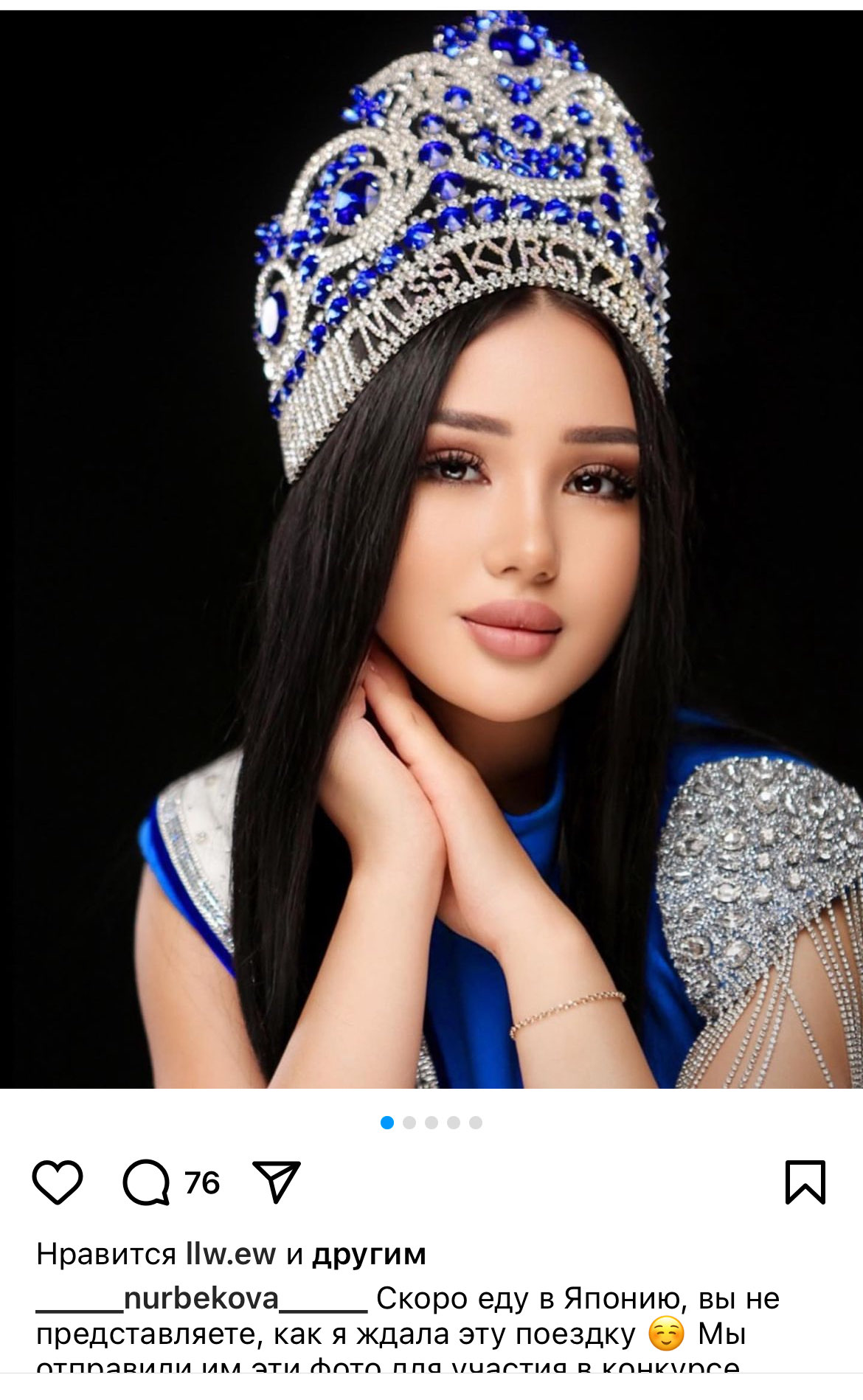 «Скоро еду в Японию, вы не представляете, как я ждала эту поездку. Мы отправили им (организаторам. — Прим. ред.) эти фото для участия в конкурсе, что вы думаете?» — написала она, разместив свое фото с конкурса, который прошел в Бишкеке.