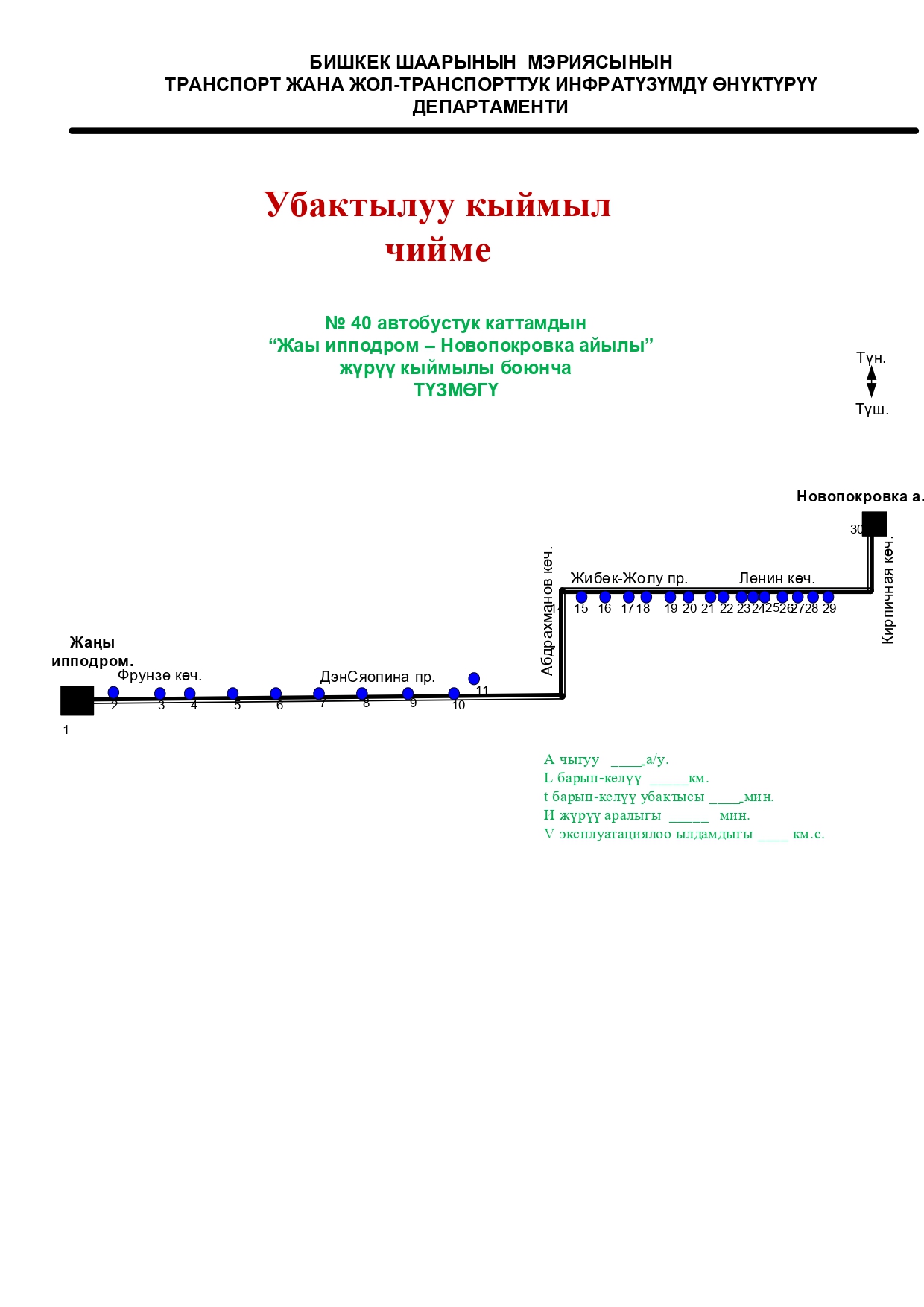 В свою очередь, муниципальный автобусный маршрут № 40 будет следовать по проспекту Чуй до улицы Абдрахманова, оттуда до проспекта Жибек Жолу и далее по прежней схеме движения.