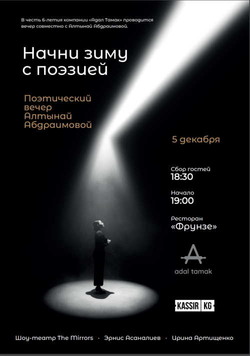 Стихи Алтынай Абдраимовой прозвучат под аккорды пианистки Ирины Артющенко. Атмосферу вечера дополнит народный артист Кыргызской Республики Эрнис Асаналиев. Специальный гость — Аман Эсенбеков.
