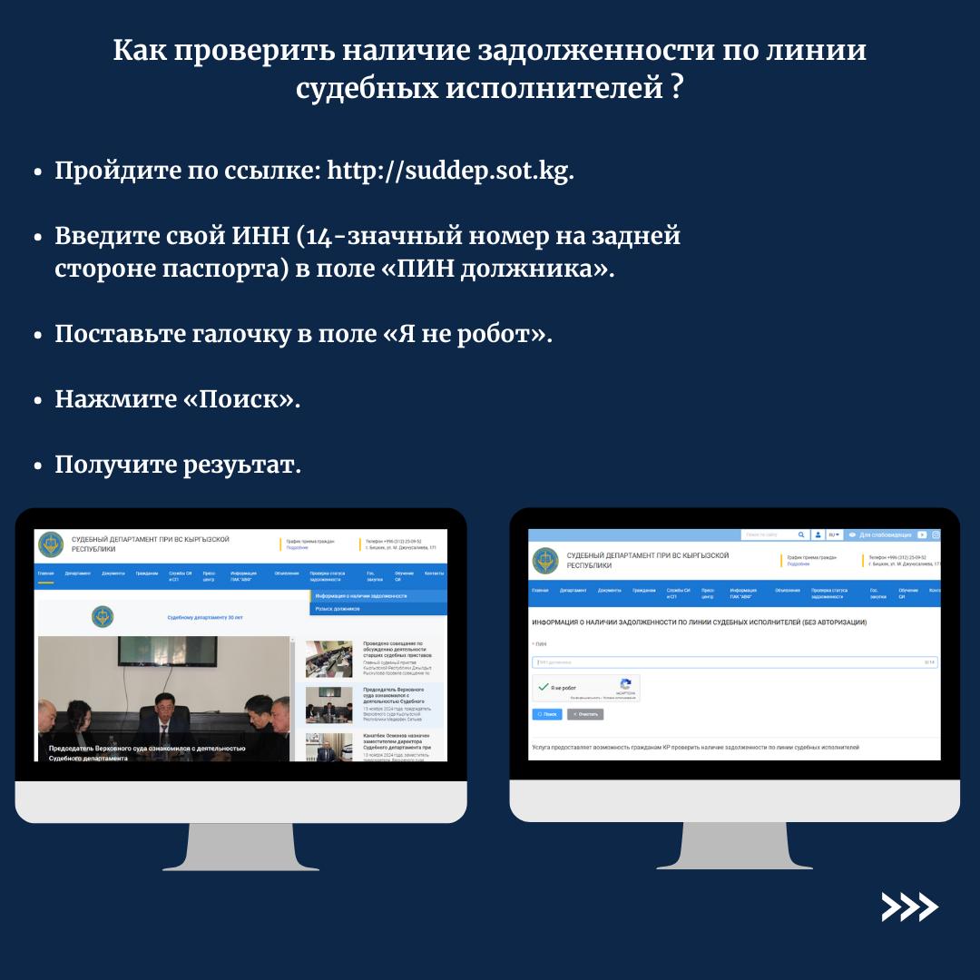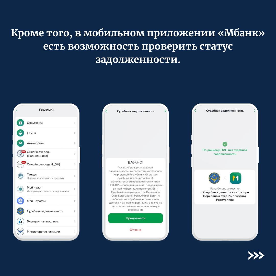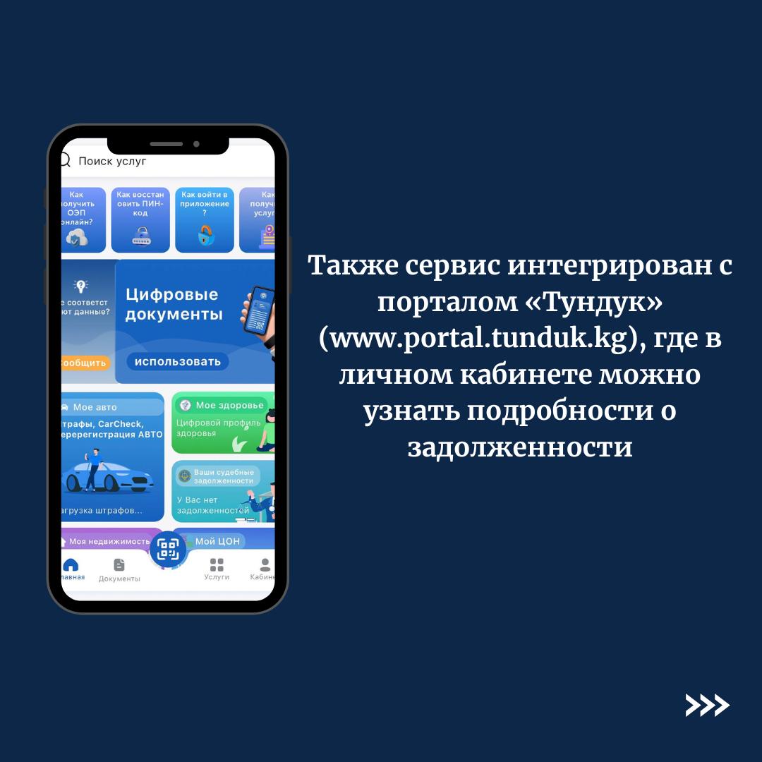 Сервис также интегрирован с порталом «Тундук» (www.portal.tunduk.kg), где в личном кабинете можно узнать подробности о задолженности, а также через другие мобильные приложения, такие как «Мбанк».