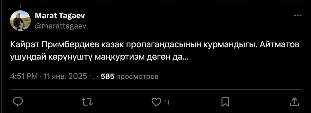 Высказывание заслуженного артиста КР вызвало бурю обсуждений. В социальных сетях на Кайрата Примбердиева обрушился шквал недовольств. Его обвиняли в «манкуртизме» и пропаганде Казахстана.