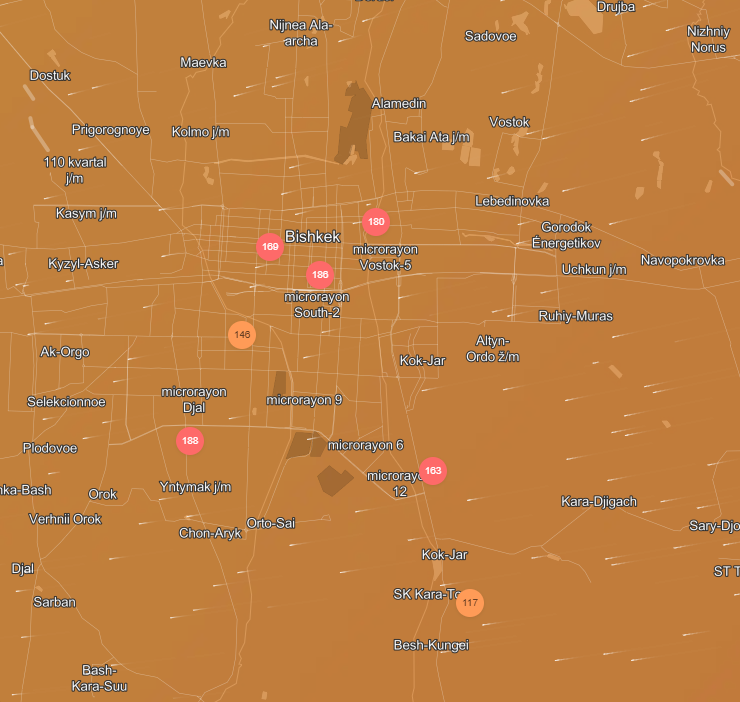 Добавим, что недавно Бишкек стал лидером по загрязнению воздуха в мире. Ранее министр природы Медер Машиев заявил, что в городе смога стало меньше. По его словам, основные причины смога — это отсутствие катализаторов у 85 процентов автомобилей в стране, увеличение количества жилмассивов вокруг столицы, хаотичное, неплановое строительство и вырубка деревьев.