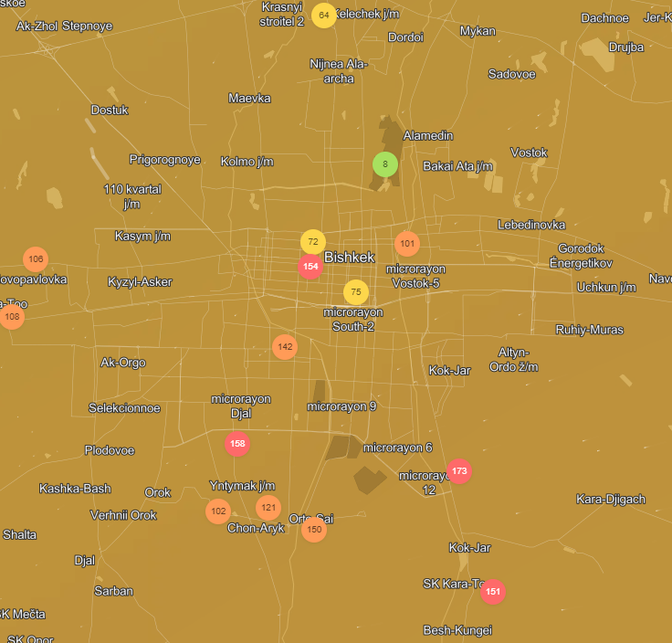 Добавим, что недавно Бишкек стал лидером по загрязнению воздуха в мире. Ранее министр природы Медер Машиев заявил, что в городе смога стало меньше. По его словам, основные причины смога — это отсутствие катализаторов у 85 процентов автомобилей в стране, увеличение количества жилмассивов вокруг столицы, хаотичное, неплановое строительство и вырубка деревьев.