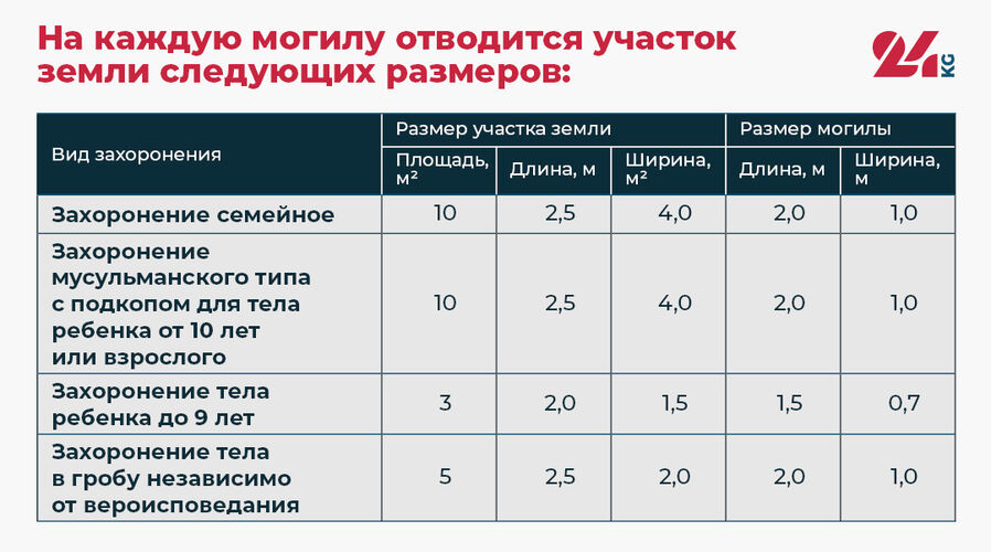 Размеры участка земли для захоронения устанавливаются местным кенешем с учетом местных условий, обычаев, традиций, вероисповедания жителей данного айыльного аймака/города на основании положений инструкции. На каждую могилу отводится участок земли следующих размеров: